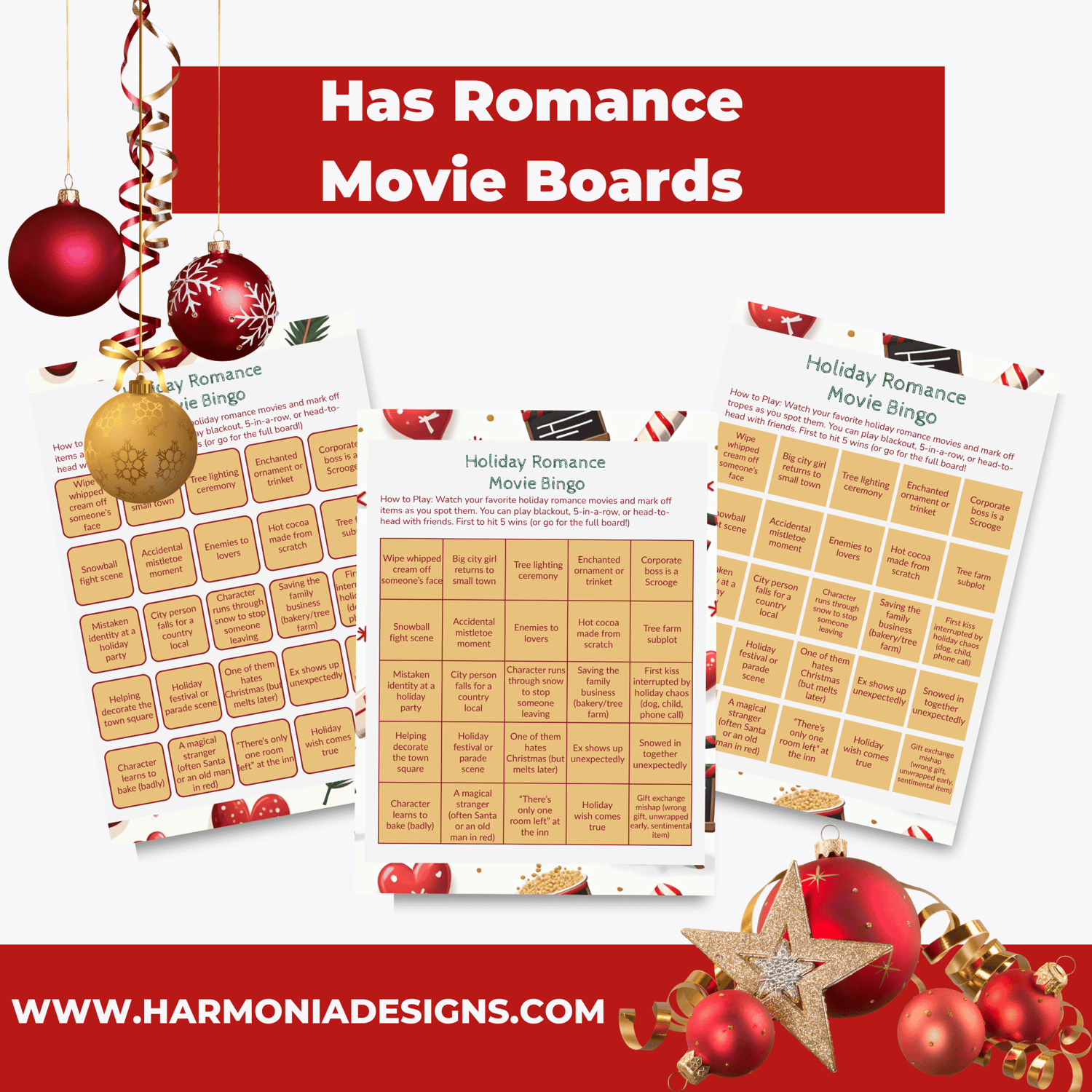 • 3 Holiday Romance Bingo cards - full of cozy tropes & swoon-worthy moments