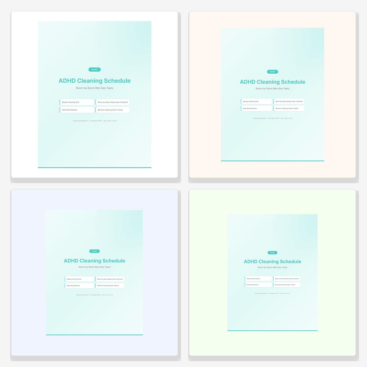 Room-by-Room Bite-Size Tasks. Weekly Cleaning Grid. Room-by-Room Deep Clean Checklist. Daily Reset Routine. Monthly Cleaning Goals Tracker. Available in US Letter (8.5x11) and A4 sizes. Instant download, print at home or at your local print shop. High-resolution PDF. This is a digital download - no physical product will be shipped. © PawsAndVibesArt