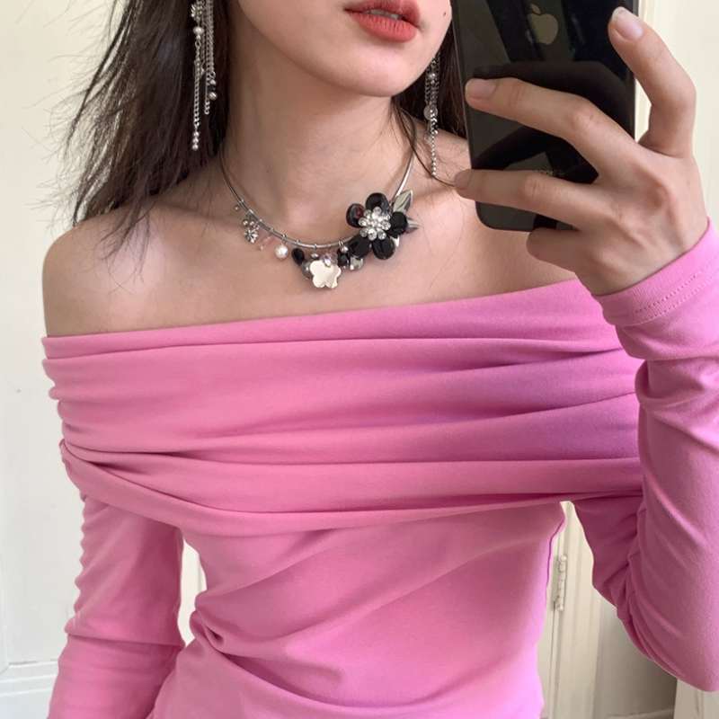 Designer black flower pink crystal titanium steel choker necklace