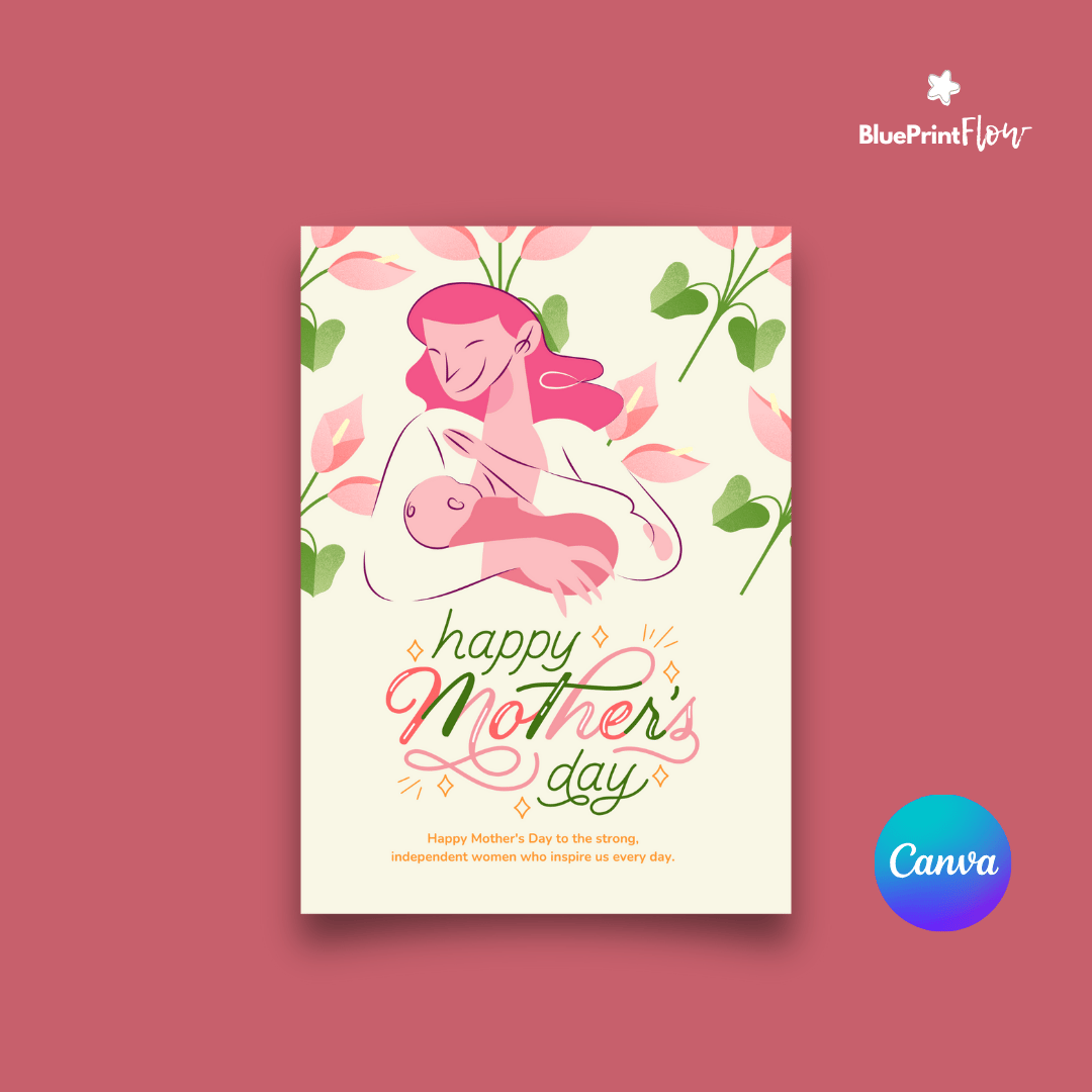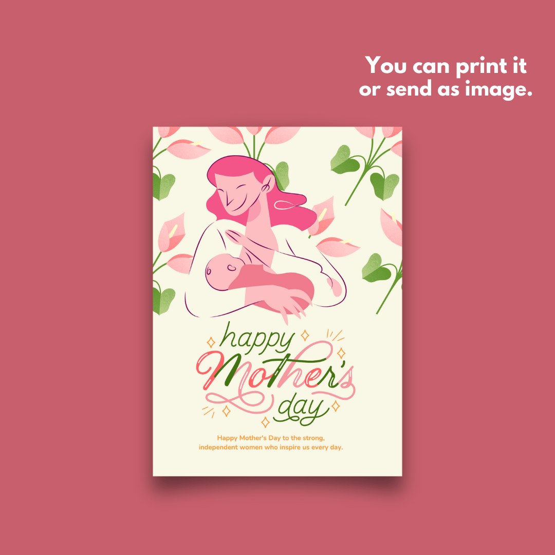 Featuring a classic and delicate floral design paired with a heartfelt illustration of a mother and child, this template is perfect for honoring the strong, independent women in your life. The soft pink and green hues exude elegance, while the typography adds a touch of charm to your celebration. Whether you’re creating printable cards, digital greetings, or social media posts, this downloadable design makes it easy to express your love and gratitude.