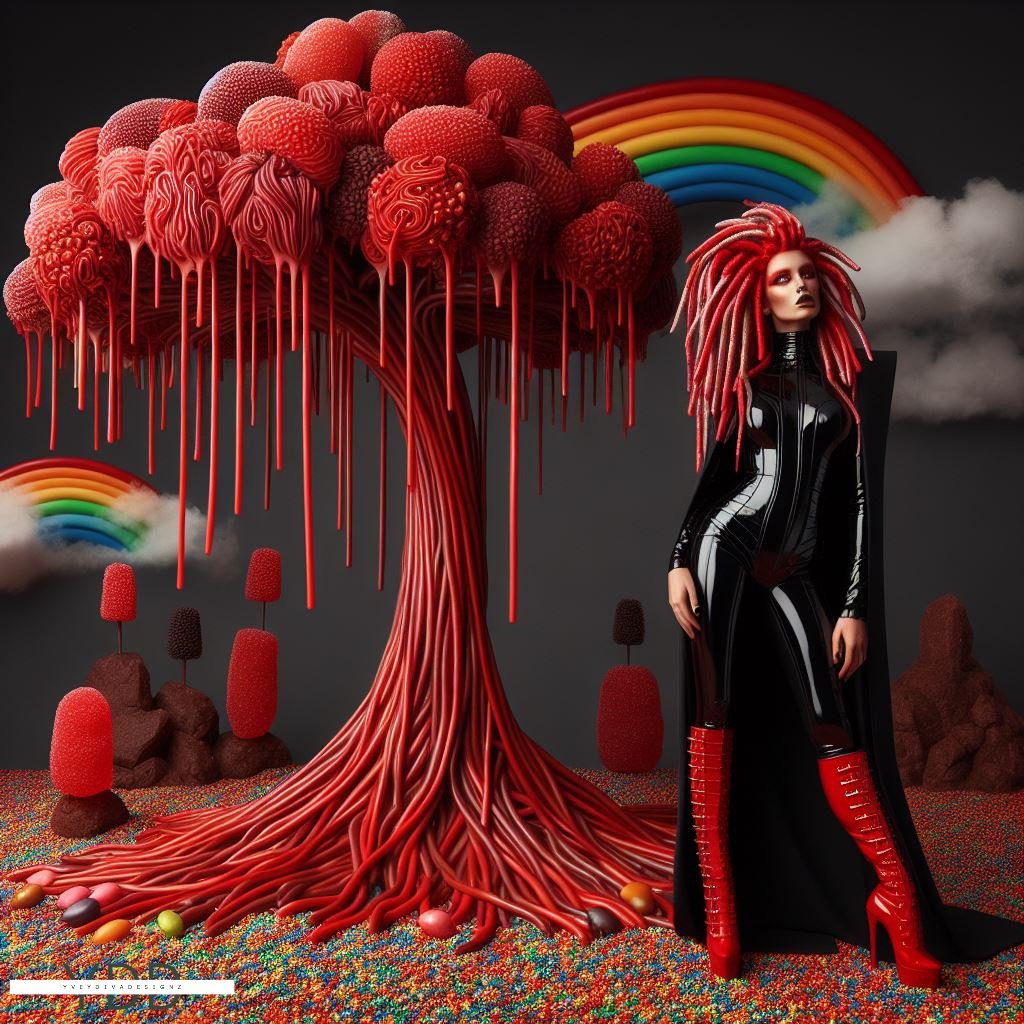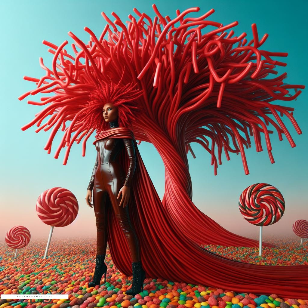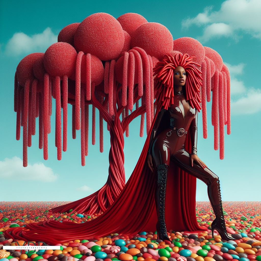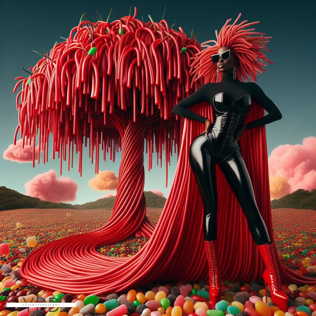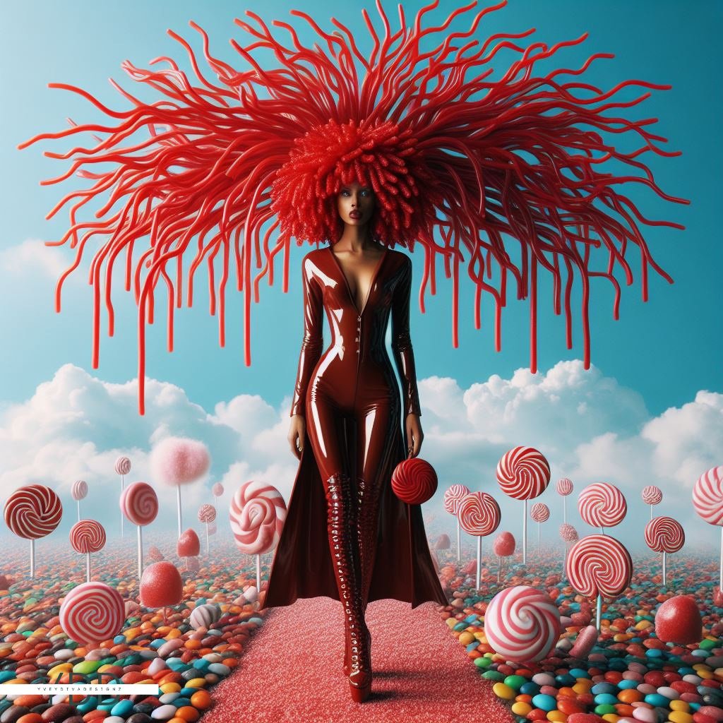Wild & Sweet: The Licorice Couture Series - Part 2, takes the licorice couture concept to bold new heights. In this installment, women don sleek patent leather jumpsuits as the licorice takes on a wild and untamed persona.