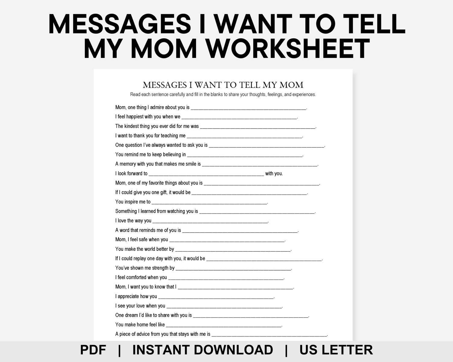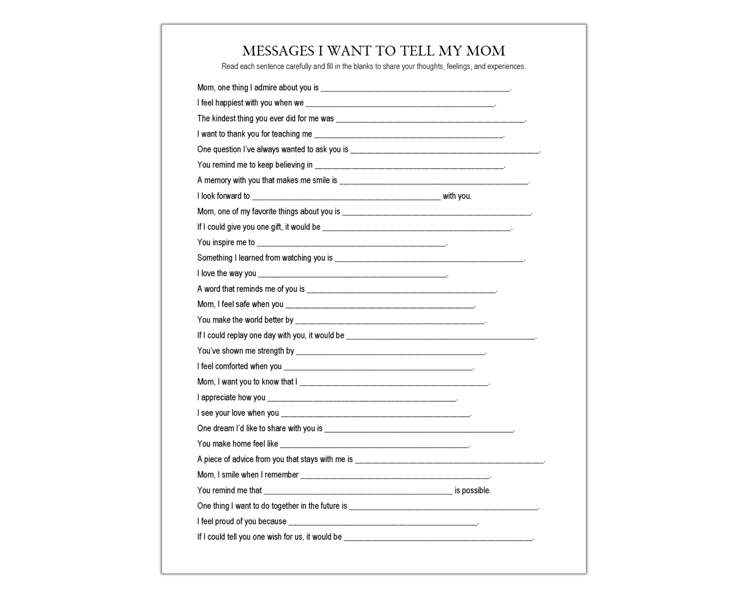 Show Mom how much she means through this Messages I Want to Tell My Mom worksheet. This resource features 30 prompts to guide kids, teens, and adults to write down memories, gratitude, and words that sometimes go unsaid. It can be used during therapy, family activities, journaling, or as a thoughtful surprise for Mom.