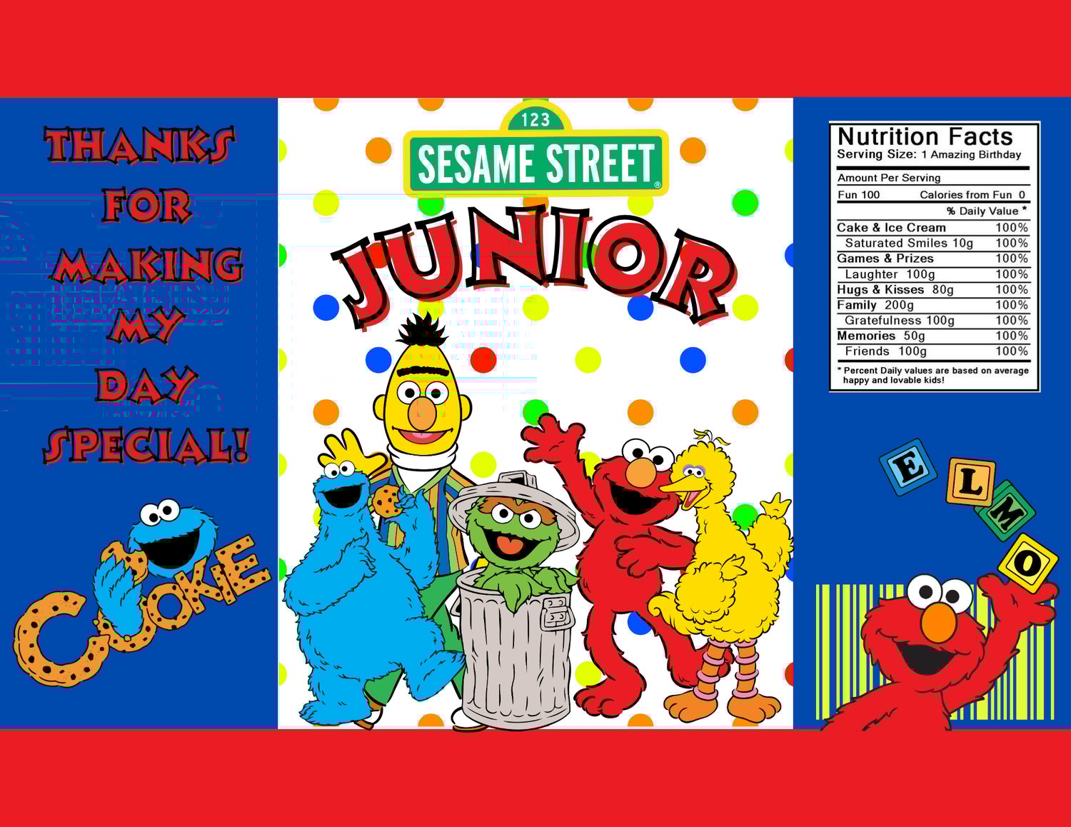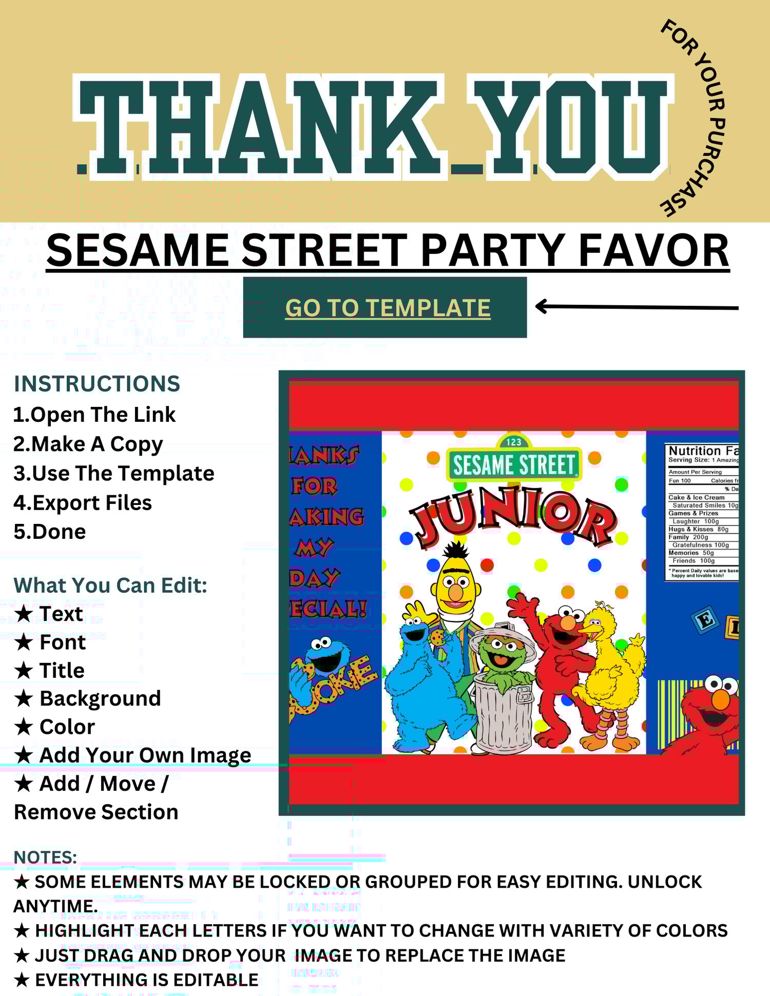 Make your Sesame Street-themed party unforgettable with our Editable Sesame Street Party Favor Templates! This set includes seven customizable designs: chip bags, rice krispie wrappers, Hershey bar wrappers, Pringles cans, water bottle labels, Capri Sun labels, and gable boxes. Perfect for birthdays and special celebrations, these templates feature beloved characters like Elmo, Big Bird, and Cookie Monster.