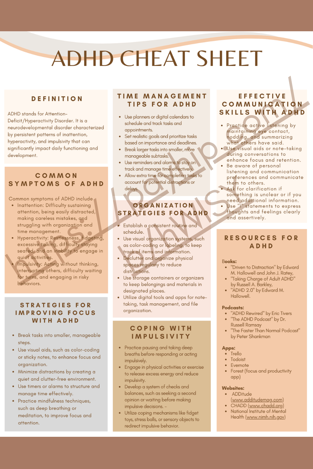 This ADHD cheat sheet offers helpful information for individuals coping with Attention Deficit Hyperactivity Disorder (ADHD). The sheet provides a definition of ADHD, Common Symptoms of ADHD, Strategies For Improving Focus With ADHD, Time Management Tips For ADHD, Organization Strategies For ADHD, Tips For Coping With Impulsivity, Effective Communication Skills With ADHD, and Resources For Managing ADHD.