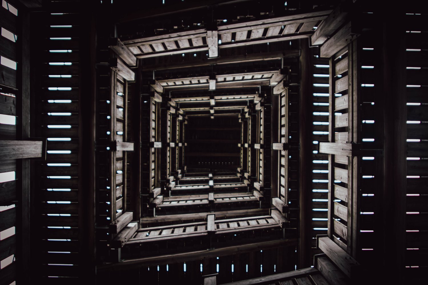 C’est au détour d’un chemin que je suis tombé sur cette tour. Une structure immense, perchée au milieu des arbres, qui offrait sans doute un panorama formidable sur toute la forêt. Avant même d’y monter, c’est la base de la tour qui m’a intrigué. En m’avançant sous elle, j’ai levé les yeux, et c’est là que j’ai été happé par ce que je voyais : un escalier en colimaçon entièrement en bois, dont les marches et les poutres formaient un motif répétitif, presque hypnotique. Une spirale géométrique qui semblait monter vers un sommet invisible, comme si elle refusait d’avoir une fin.
