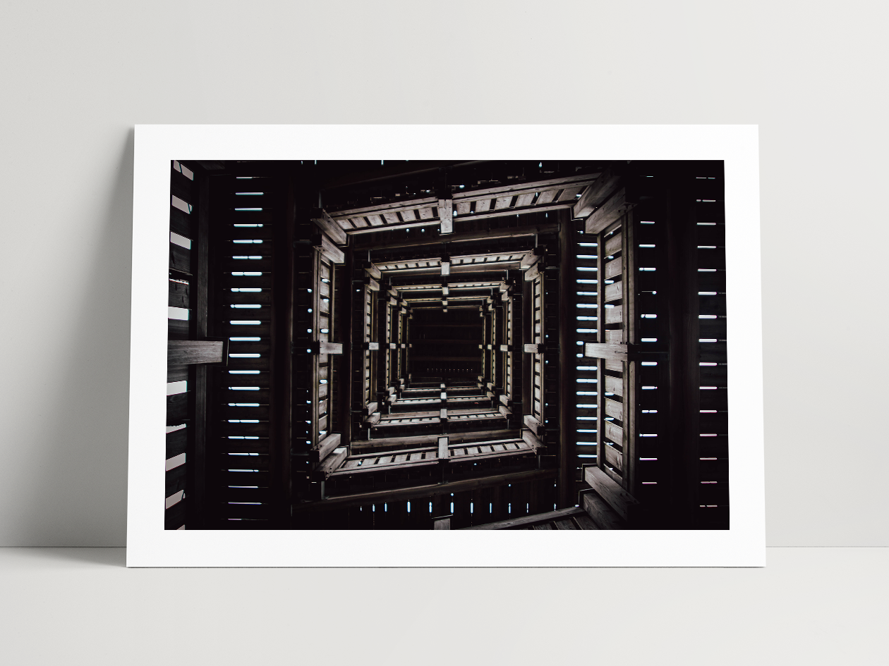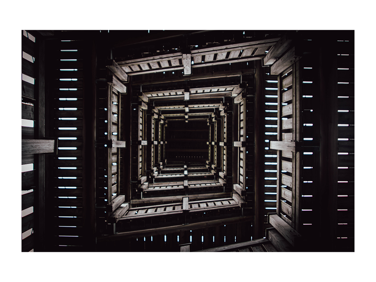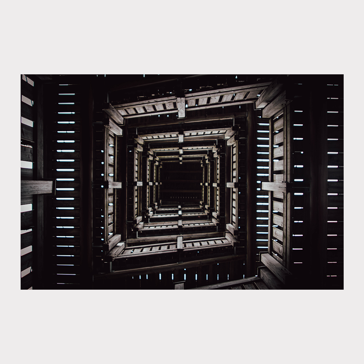 Cette photo a été prise sous une tour de guet, alors que j’étais au sol. En levant la tête, j’ai été happé par le motif répétitif de l’escalier en colimaçon, un enchaînement de lignes et de géométries en bois qui semblaient monter vers un sommet sans fin. J’ai pointé mon objectif vers le haut pour capturer ce jeu d’hypnose, cette spirale qui absorbe le regard.