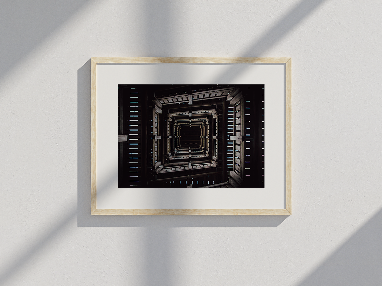 J’ai alors sorti mon appareil, et j’ai cadré vers le haut, exactement depuis le sol. Je voulais capturer cette sensation étrange : ce mélange de profondeur et d’élévation, cette impression d’être devant un puits inversé, un tunnel vertical qui ne mène pas vers le bas mais vers une forme d’infini. Cette photo est pour moi un jeu d’optique, un trompe-l’œil qui, selon la façon dont on le regarde, peut évoquer une ascension, une chute, une spirale intérieure, ou simplement une répétition architecturale fascinante.