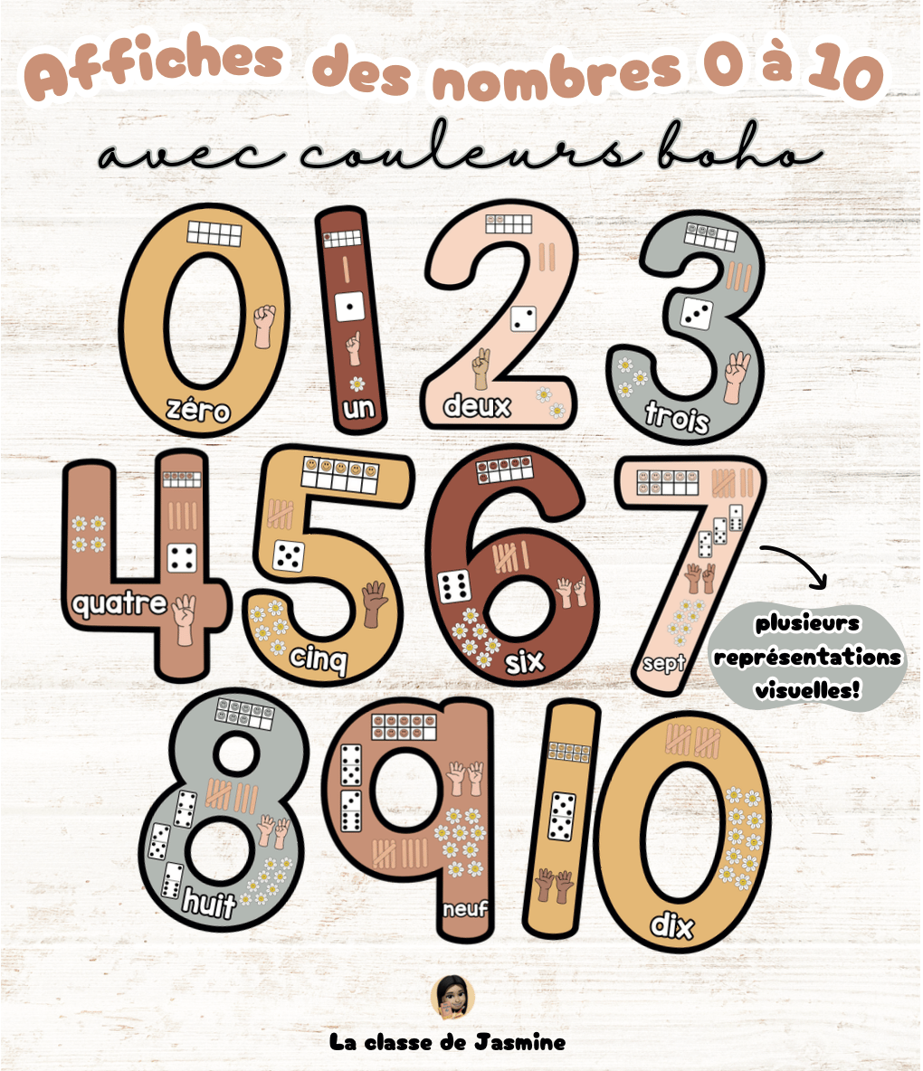 Parfaites pour la maternelle et le 1er cycle, ces affiches aident les élèves à reconnaître et comprendre les nombres de 0 à 10 grâce à plusieurs représentations visuelles (doigts, dés, objets, etc.). Chaque nombre est présenté sur une feuille 8,5 x 11, prête à être affichée pour créer un coin mathématique harmonieux et attrayant dans votre classe.