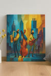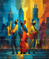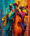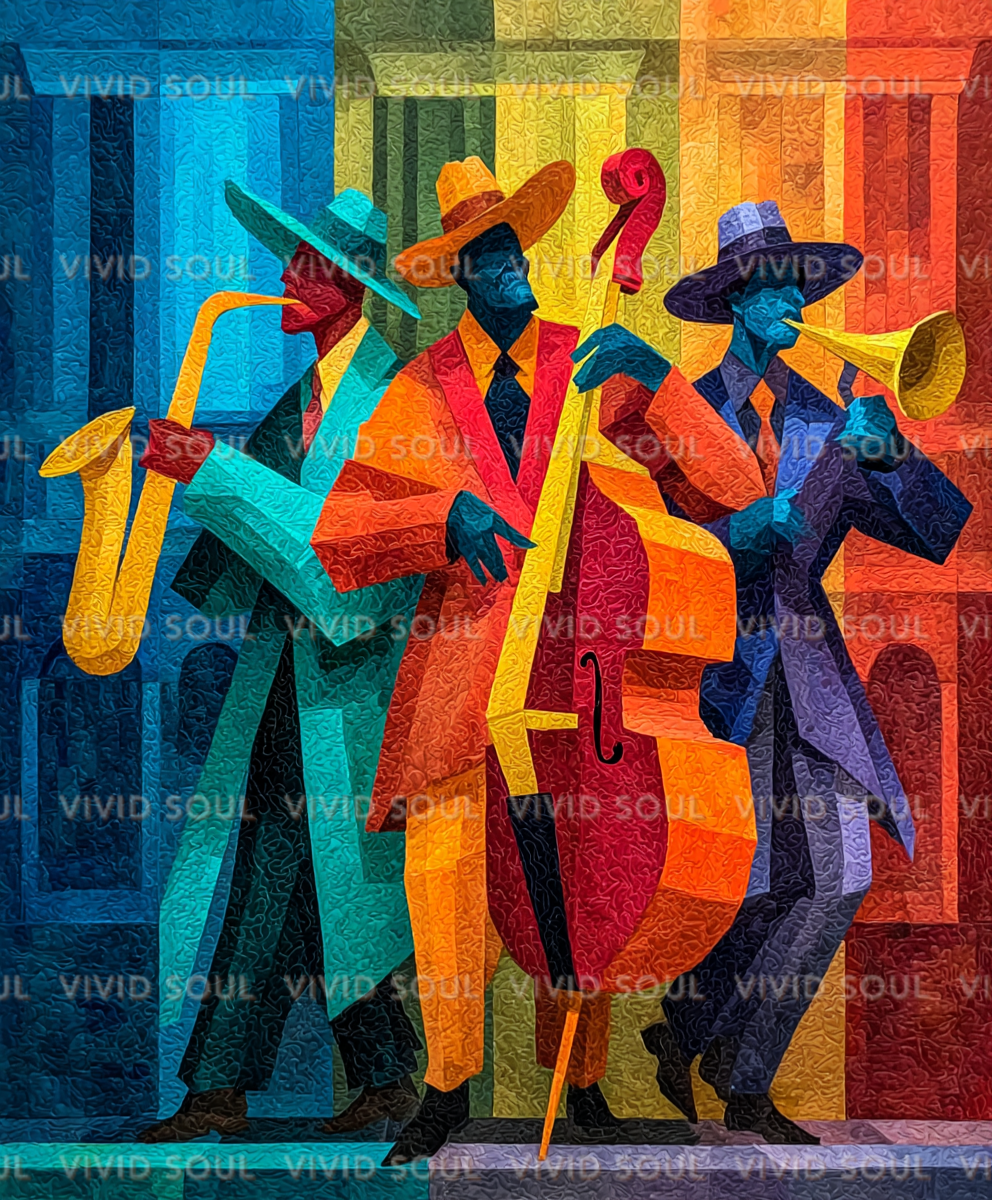 Add rhythm and bold color to your digital collection with this vibrant 4-piece jazz-inspired art set. Each piece features geometric style musicians in striking colors, perfect for screensavers, small prints, social media content, or creative projects.