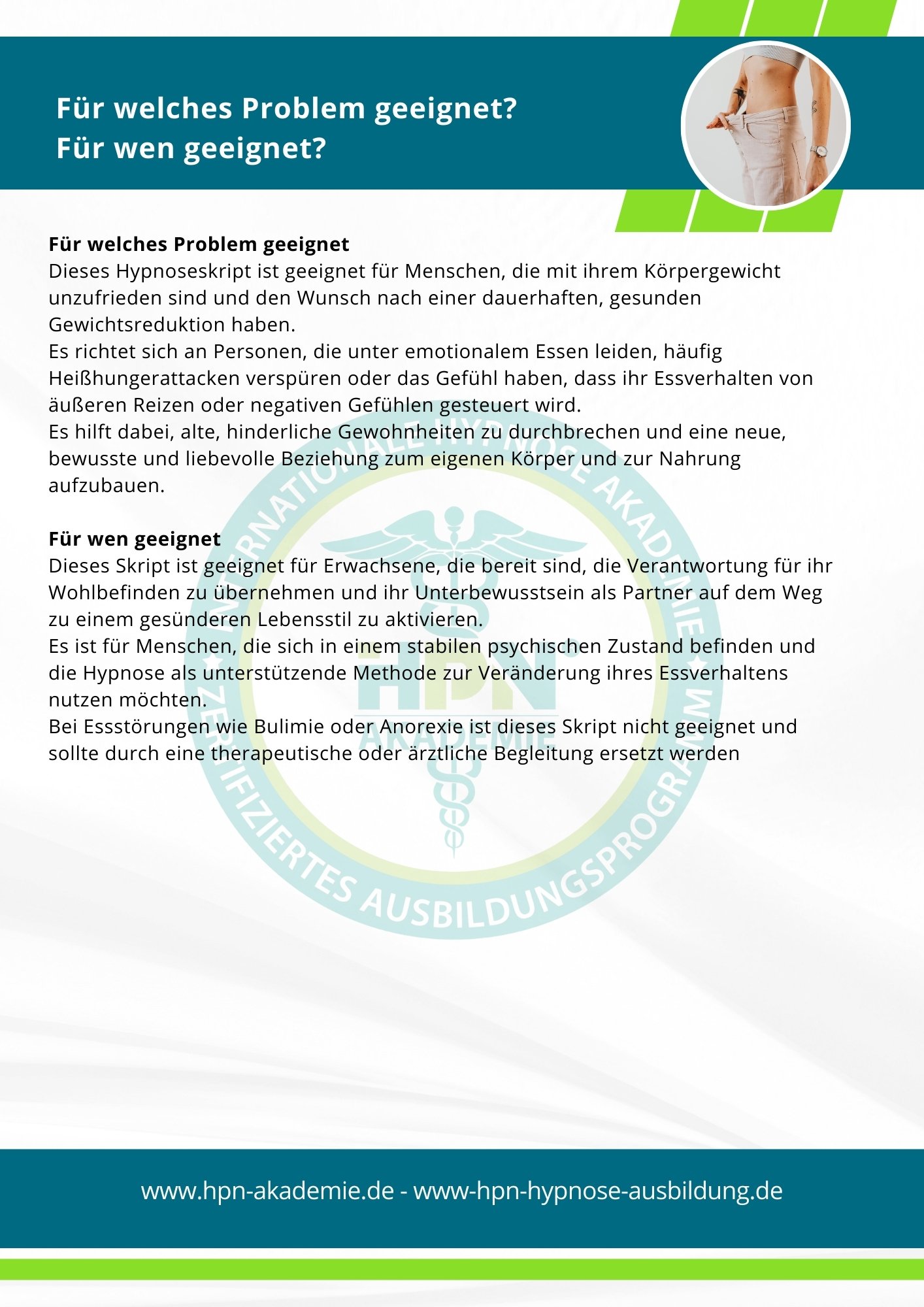 Es ist für Menschen, die sich in einem stabilen psychischen Zustand befinden und die Hypnose als unterstützende Methode zur Veränderung ihres Essverhaltens nutzen möchten.