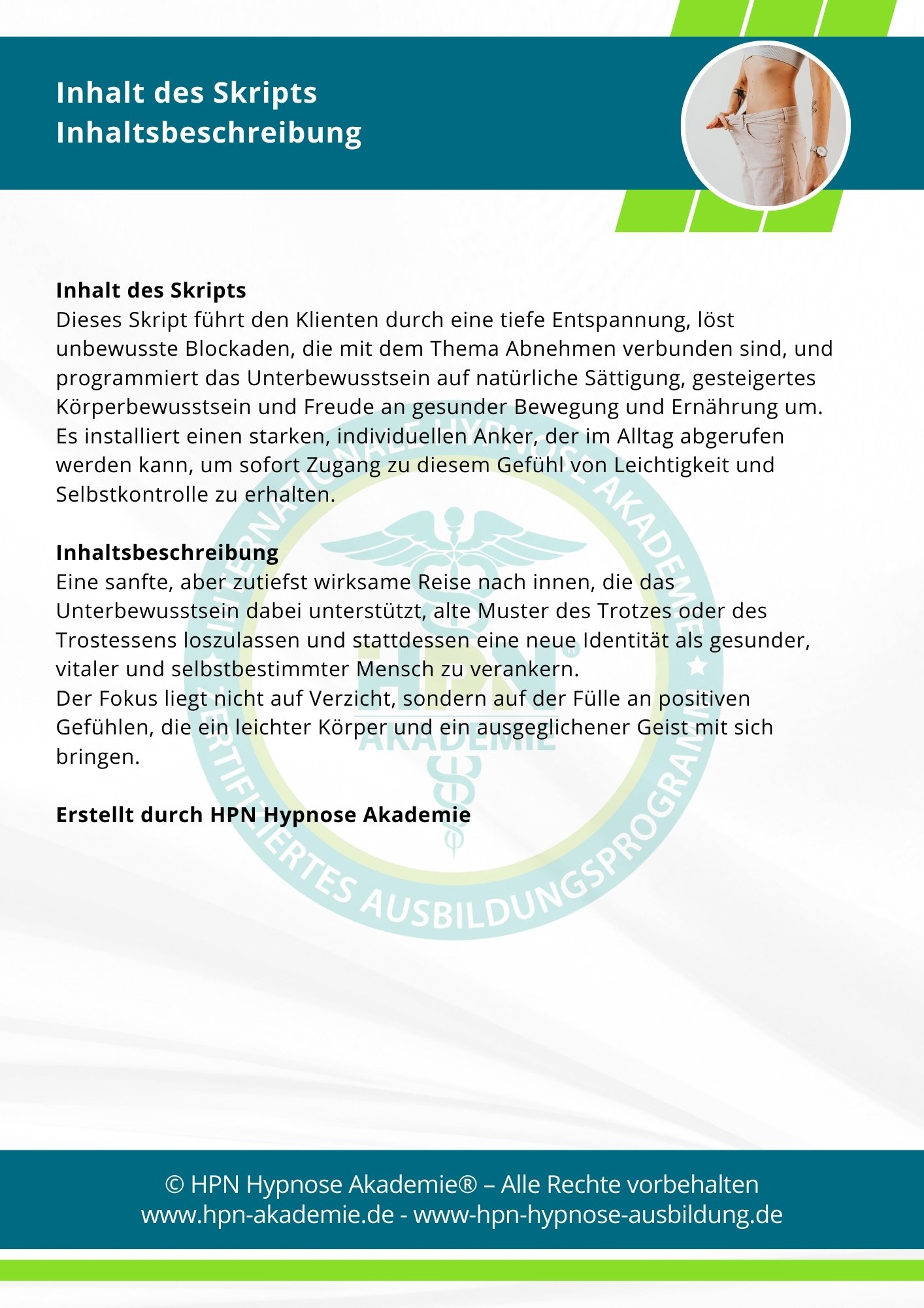 Dieses Skript führt den Klienten durch eine tiefe Entspannung, löst unbewusste Blockaden, die mit dem Thema Abnehmen verbunden sind, und programmiert das Unterbewusstsein auf natürliche Sättigung, gesteigertes Körperbewusstsein und Freude an gesunder Bewegung und Ernährung um.