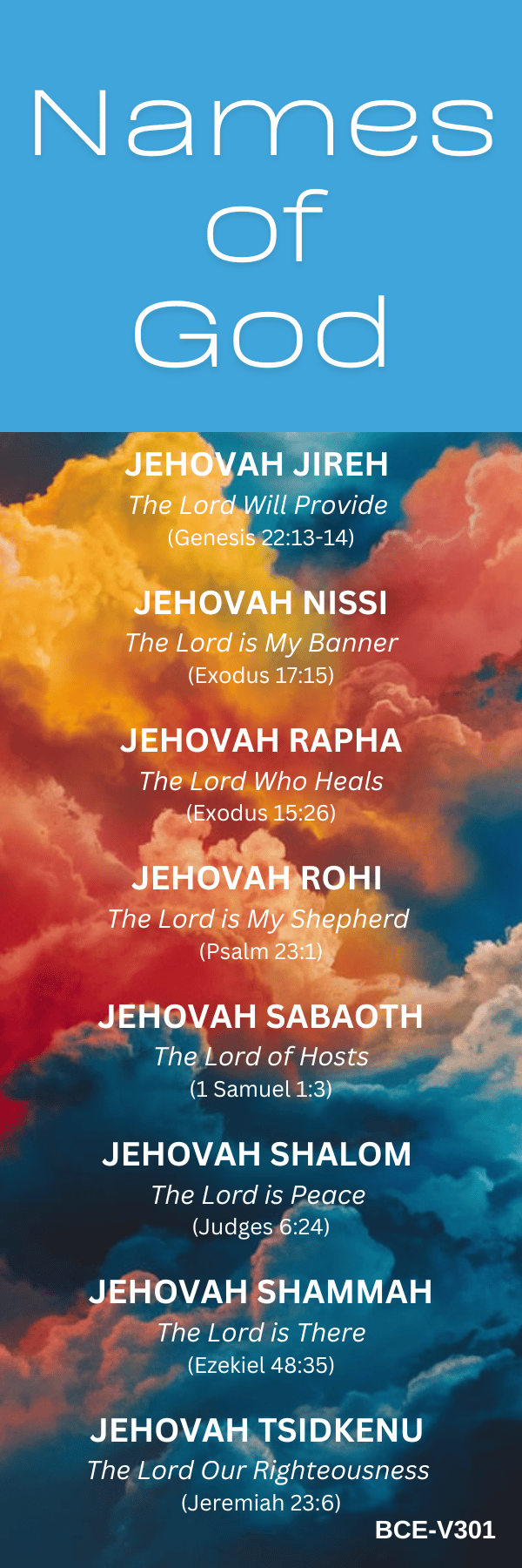 The NAMES OF GOD - BOOKMARKS include 7 colorful and printable bookmarks featuring some of the most popular Names of God with their meanings and scripture references.