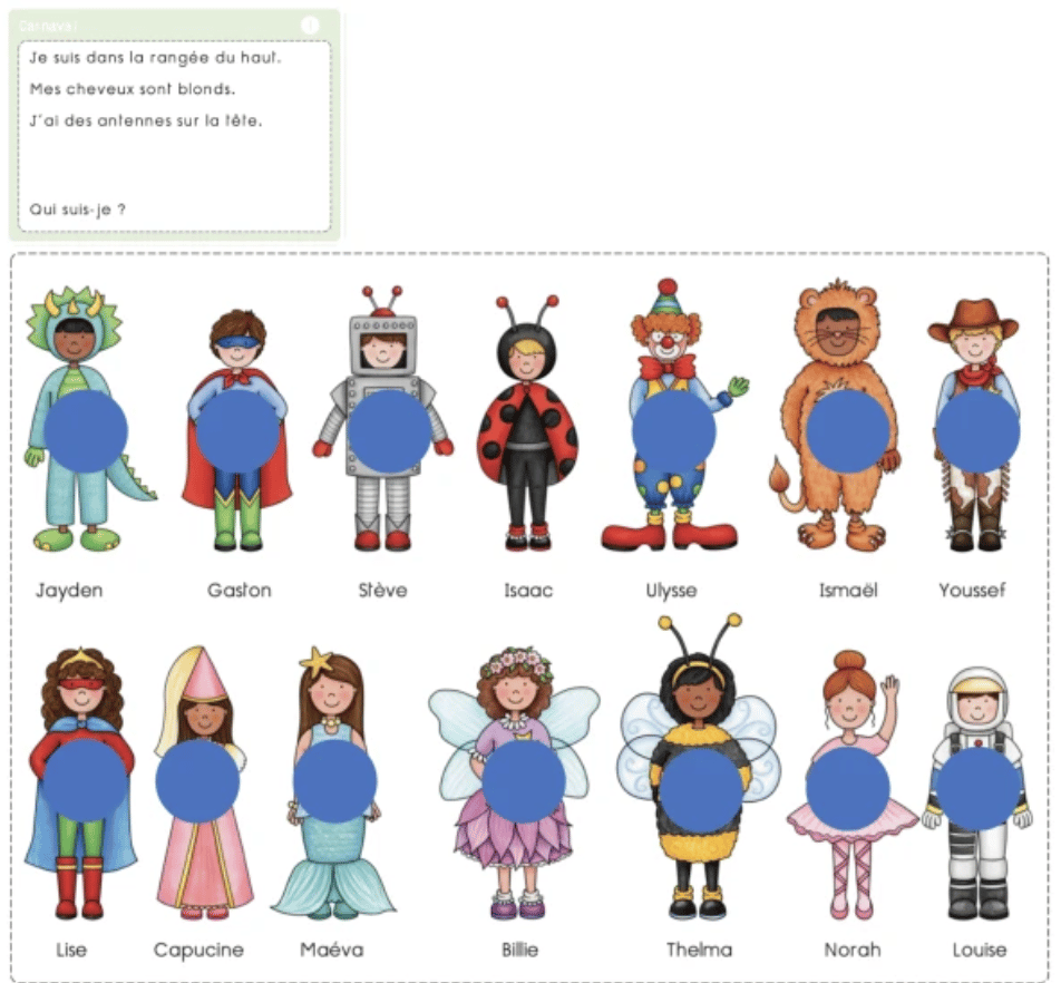 L'élève doit retrouver le personnage mystère. Pour ça, il lit la carte et pose des jetons sur le plateau pour "éliminer" les personnages. A la fin, il n'en reste qu'un.
