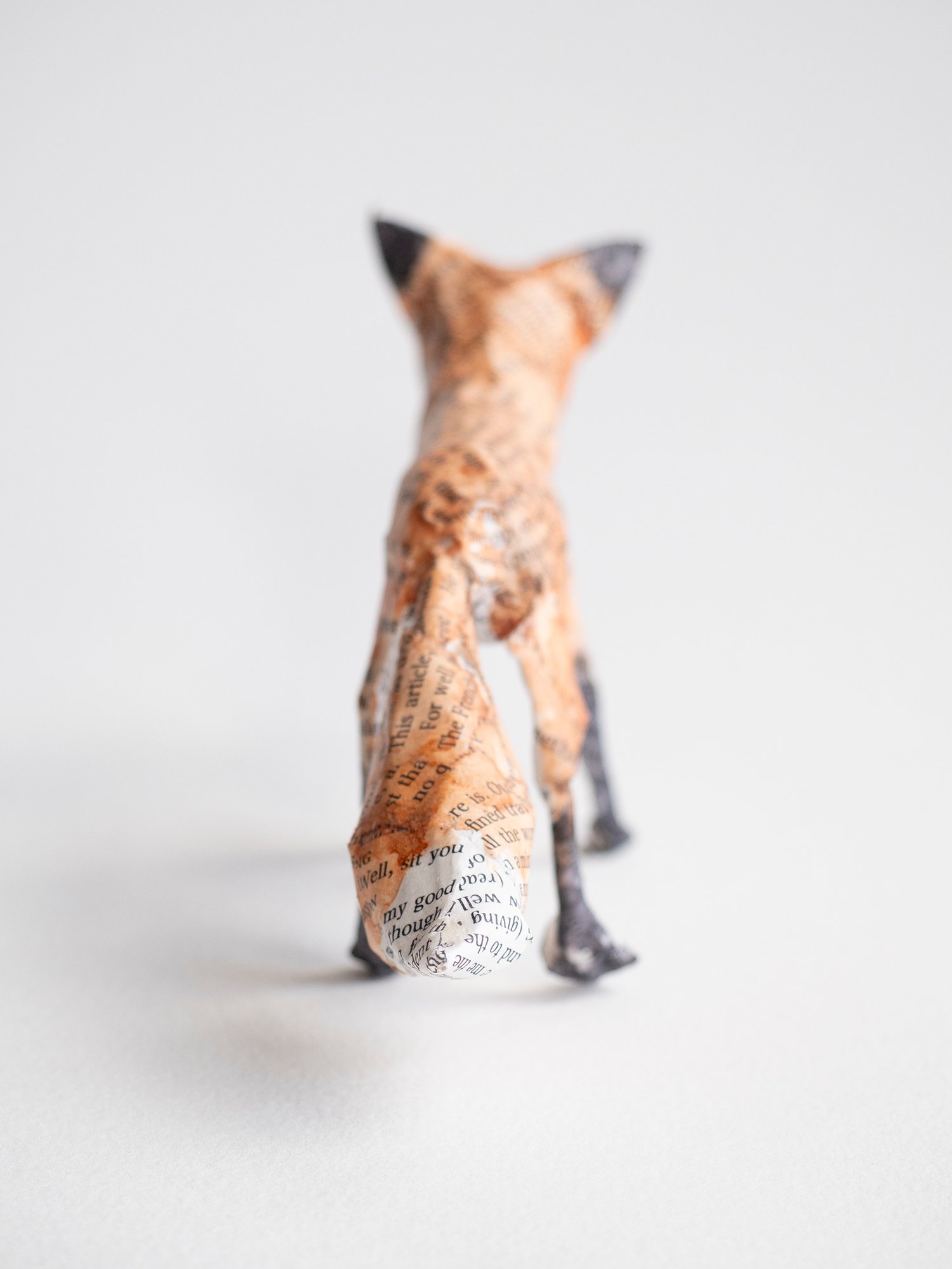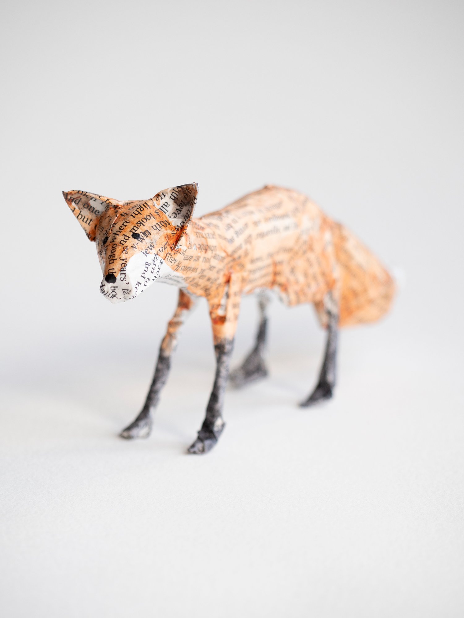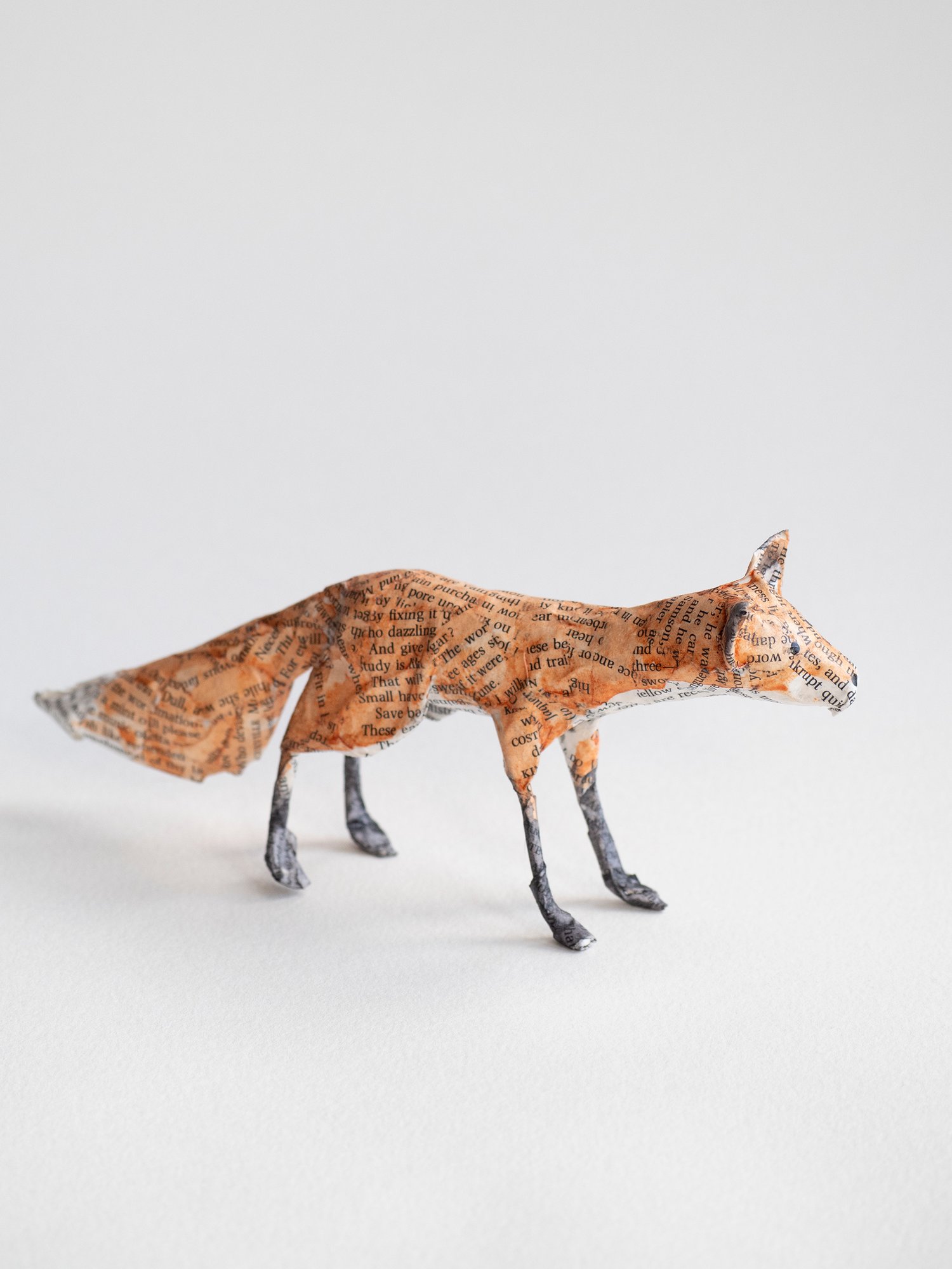 A handmade paper mache folk art sculpture of a standing fox. It is created from paper mache using book paper, wire and watercolour and is approx 7cm high x 17cm long. Made with newspaper, wire, glue, pages from Shakespeare, and watercolour paint.