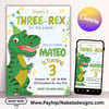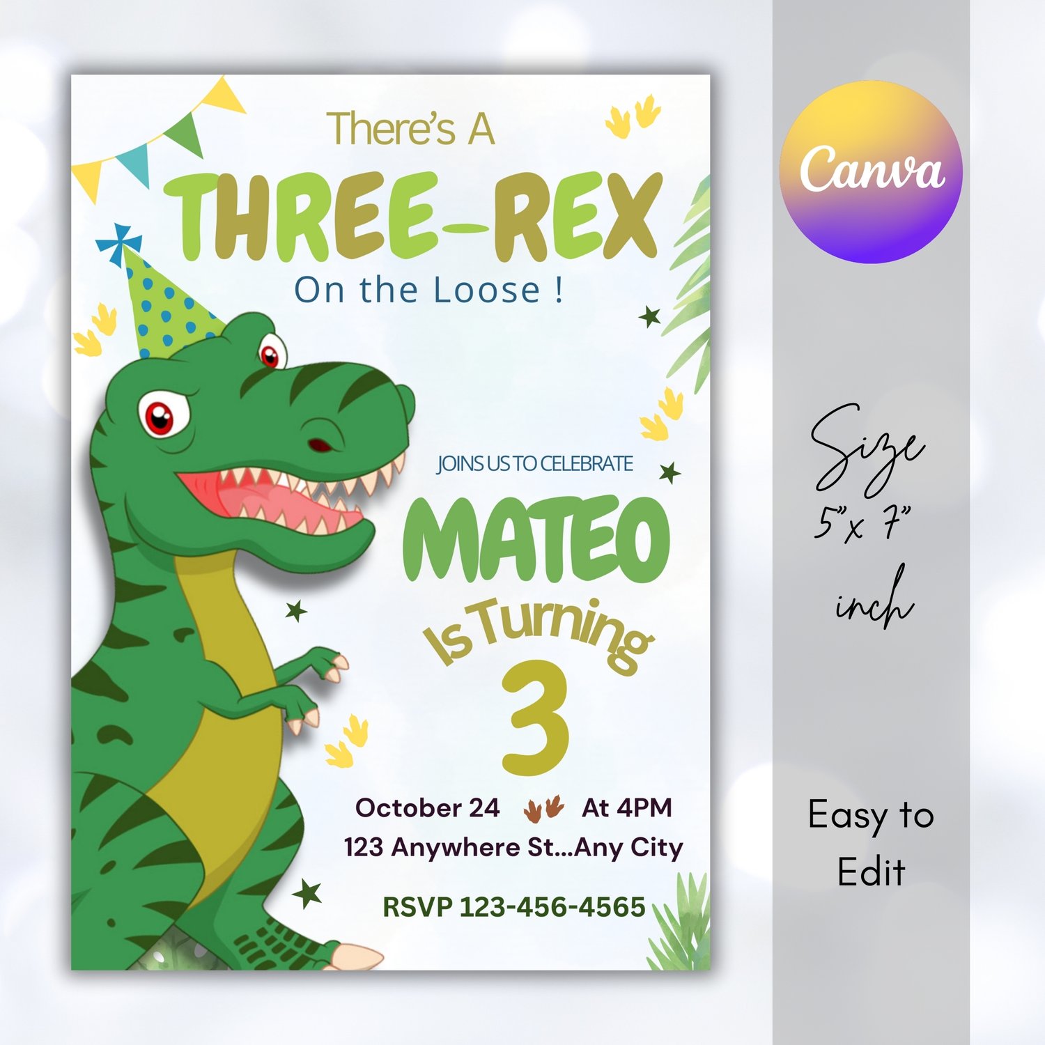 Dinosaur Birthday Invitation, Three Rex Birthday Invitation, Green Dino Party Canva Template, Printable 3rd Birthday