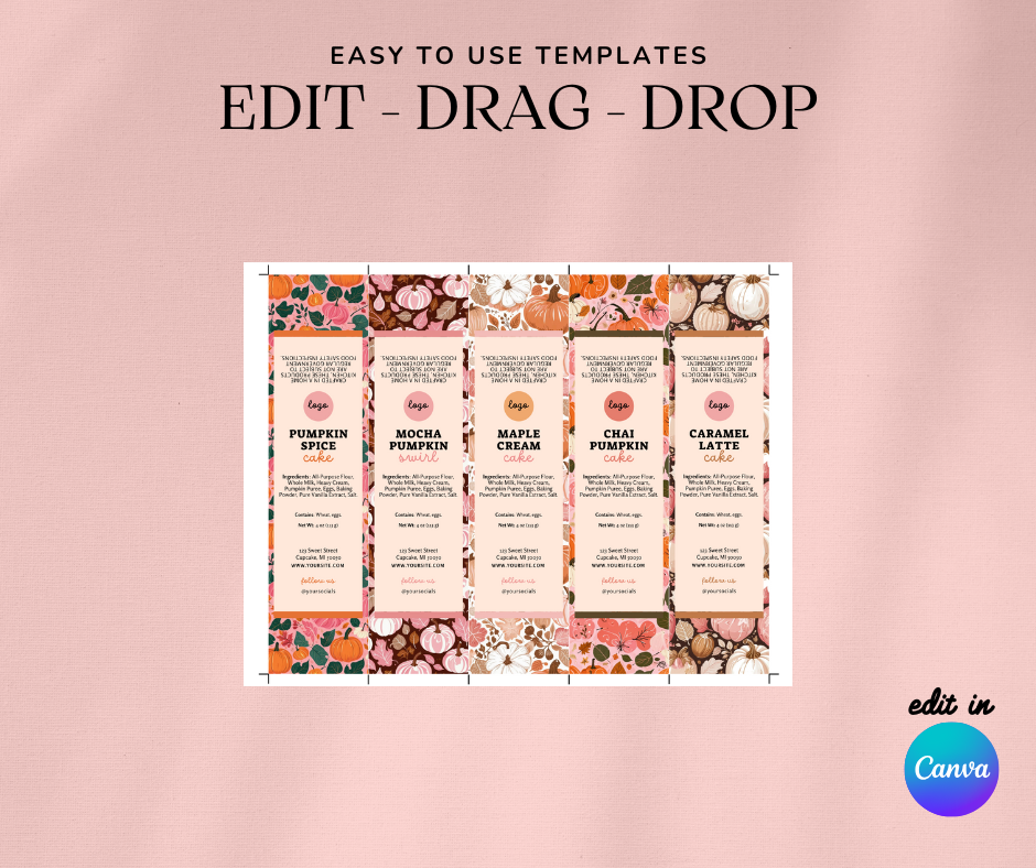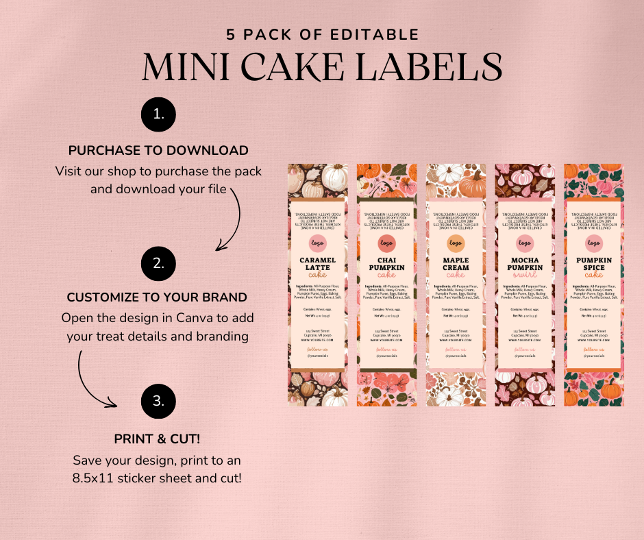 Bring cozy autumn vibes to your treats with this set of five editable pumpkin-themed mini cake labels. Each design features a different fall custom designed fall pattern — making your packaging look polished, festive, and irresistible.