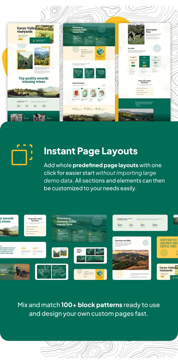 Gwyneth is customizable barrier-free block theme with full site editing capabilities. Created with ecological farming and agriculture in mind, yet versatile for any purpose. You can even use it in classic theme mode with the advantage of editing all theme parts with block editor, not code → a truly hybrid, universal and future-proof solution.