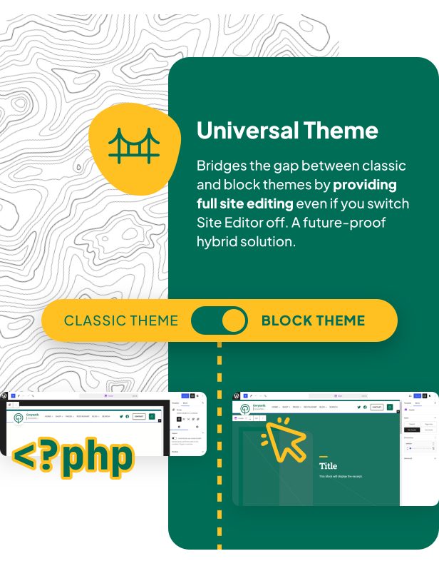 The theme allows you to switch full site editing experience off, and yet you can still modify all theme parts visually in block editor without a line of code.