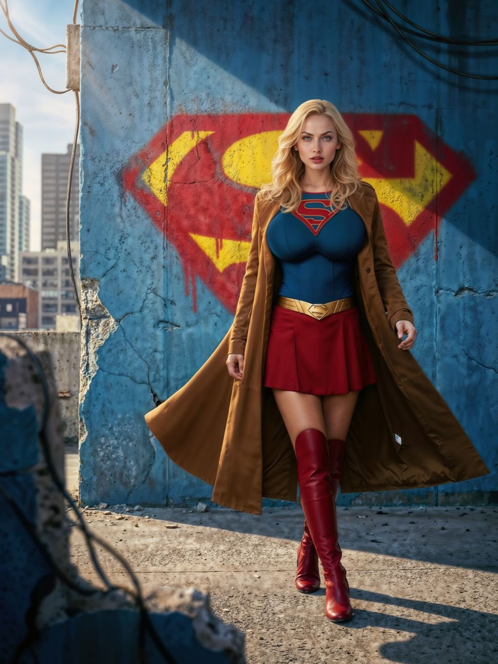 In this 14K ultra-high-resolution artwork, Samantha steps across a gritty rooftop scene framed by raw concrete, dangling cables, and a weathered wall stamped with a bold, spray-painted “S” emblem. The contrast is electric: street-level texture meets iconic hero energy. A windswept trench coat flares behind her like a modern cape, while the deep blue suit, crimson skirt, gold belt, and towering red boots create that unmistakable superhero palette—sharp, confident, and cinematic.