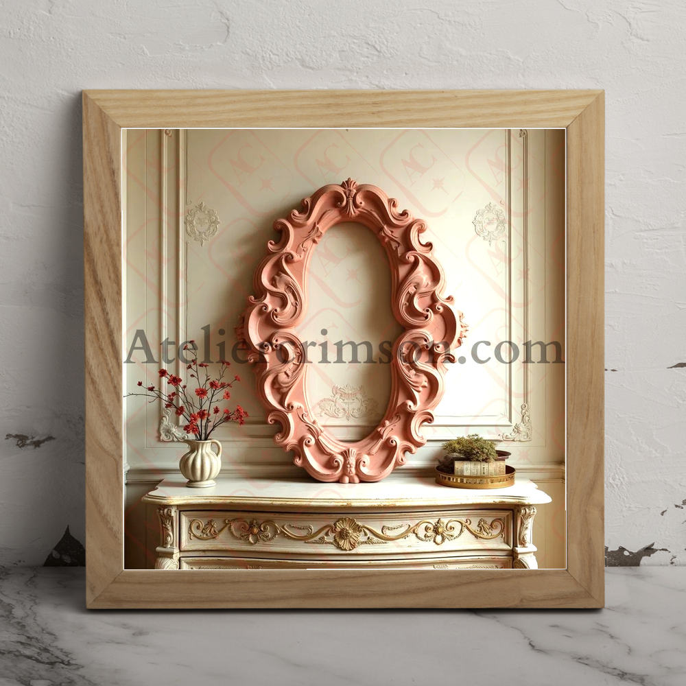 Number 0 terracotta Art Nouveau typeface inspired by Alphonse Mucha's with flowing lines and floral motifs, set against a soft, muted background with a gilded wooden dresser and subtle lighting effects.