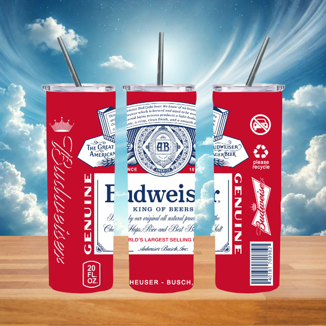 Toast to the King of Beers with this stylish 20 oz sublimation tumbler, featuring the iconic Budweiser label design. With its signature red and white branding, classic crest, and unmistakable Budweiser logo, this tumbler brings timeless brewery charm to your everyday beverage experience.