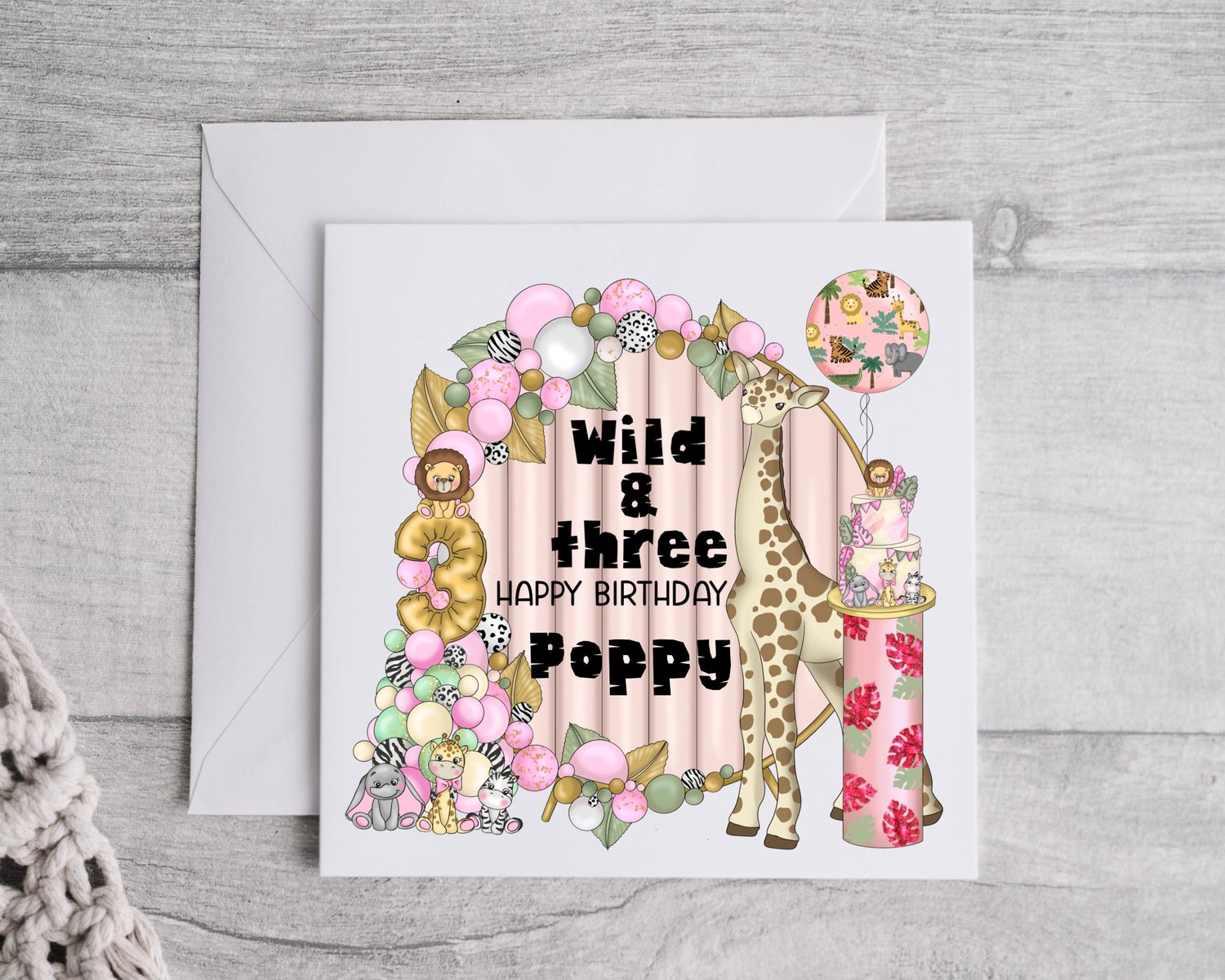 Pink Wild & Three Safari Birthday Card - Can be personalised