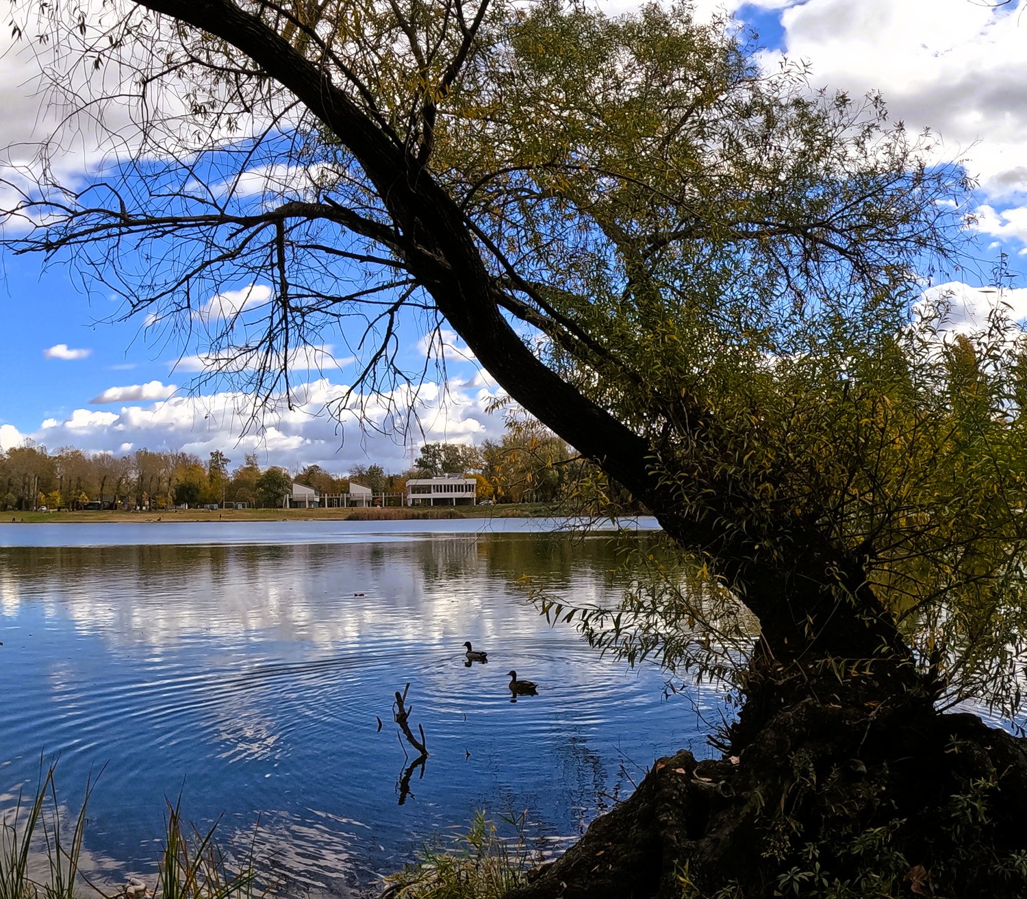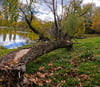 tree, broken, lake, autumn, water, reflection, nature, clouds, fallen, landscape, outdoor, shoreline, grass, branch, peaceful, scene, calm, environment, trunk, moody, texture, cloudy, still, park, season, wilderness, decay, rural, fallenleaves, weather, sky, overcast, scenic, forest, natural, quiet, blue