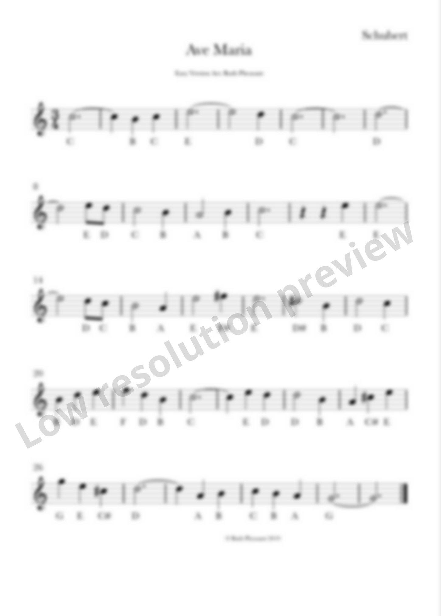 4. Ave Maria easy version - Very easy version of the melody for Schubert's Ave Maria. Includes letter names on every note. Right hand treble clef only. 31 bars. This can start to increase your confidence with moving out of five finger positions on the piano. The previous three tunes are in five finger hand positions (middle C position, C major position, A minor position).