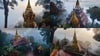 Wat Phra That in Southeast Asia shrouded in morning fog, captured with a wide-angle lens to enhance the mysterious atmosphere.