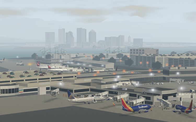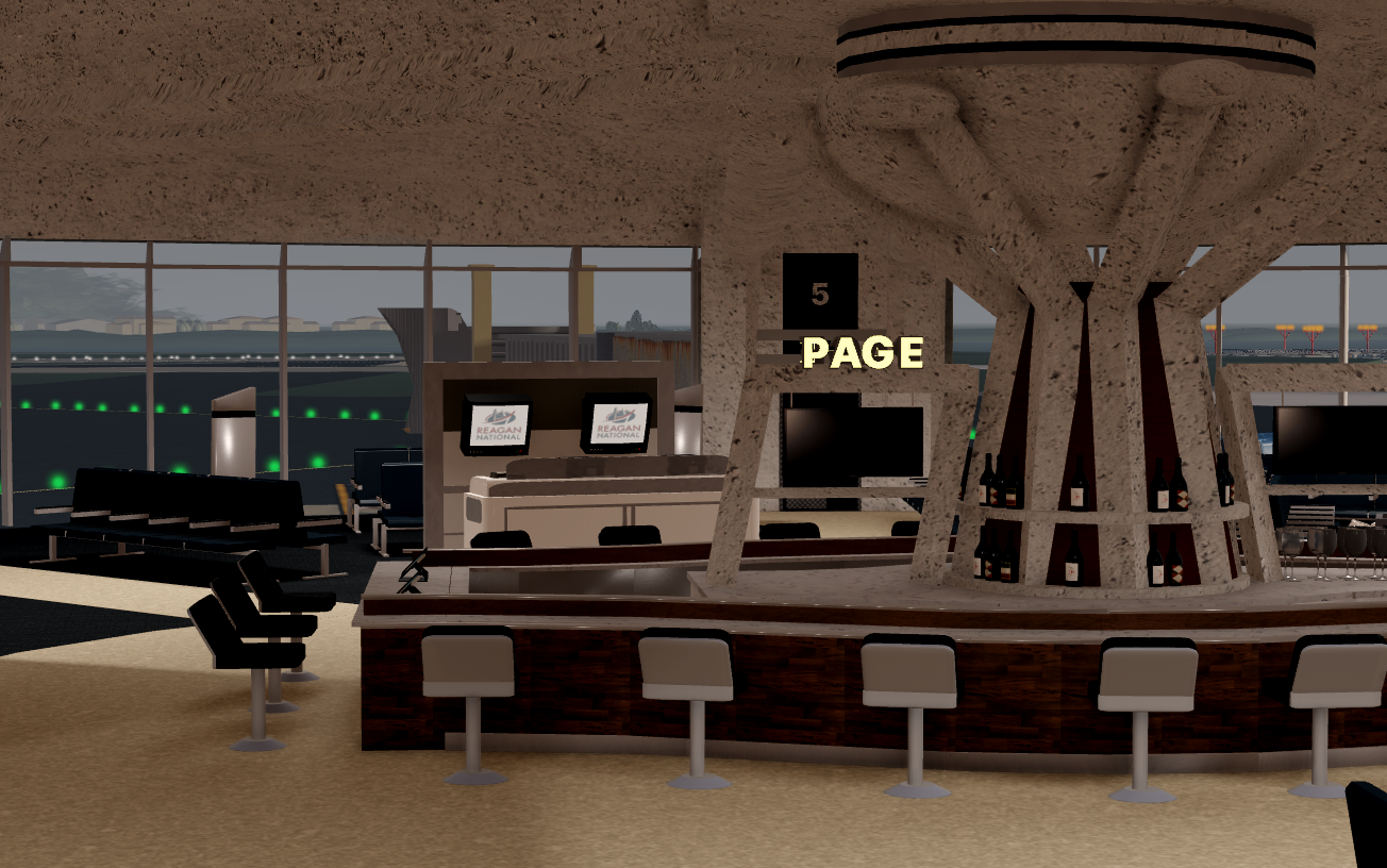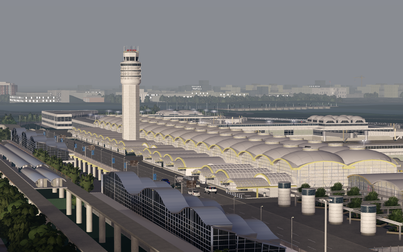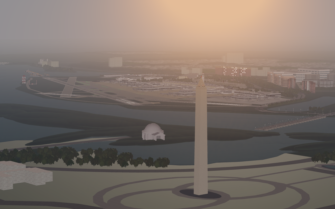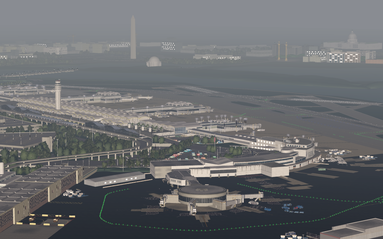 -Immersive scenery reflective of the airport's surrounding areas including downtown D.C., the National Mall, Washington Monument, United States Capitol, and the Woodrow Wilson Memorial Bridge.