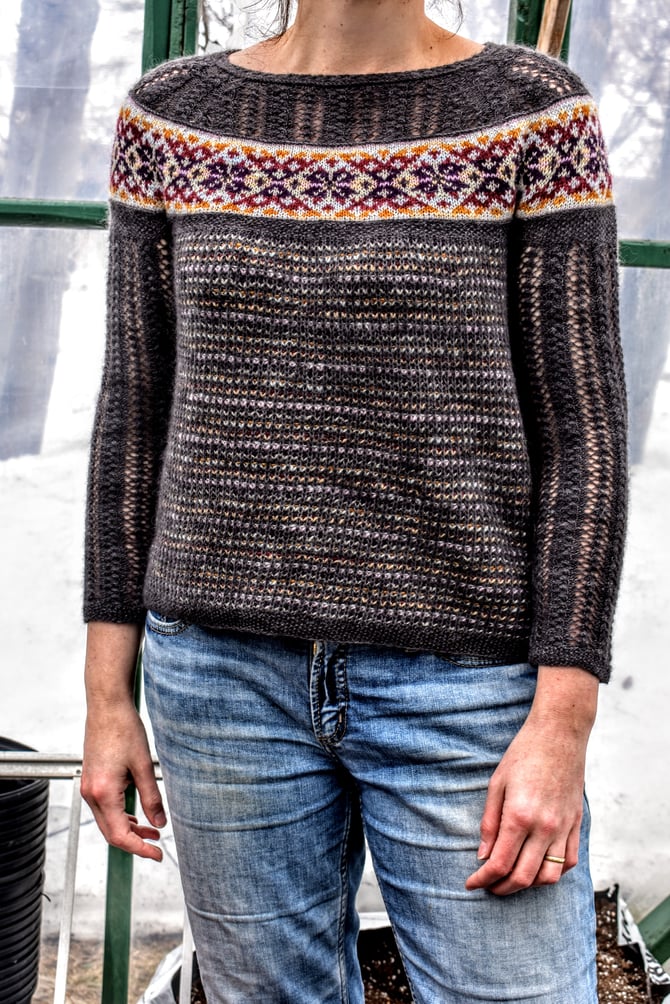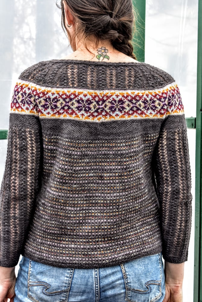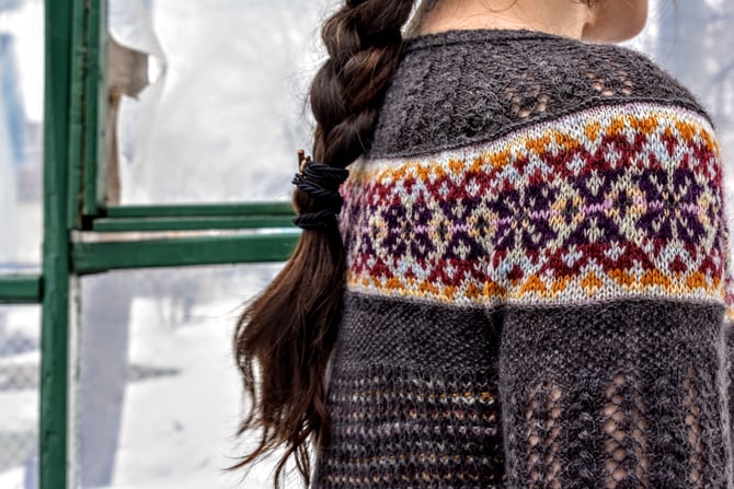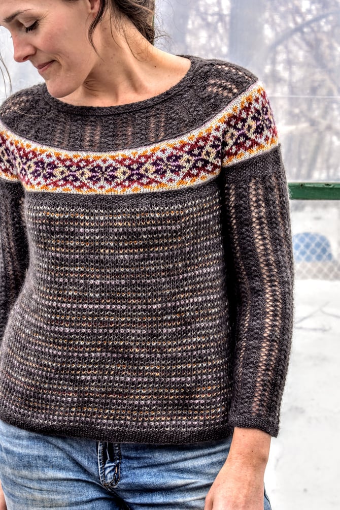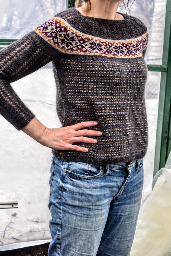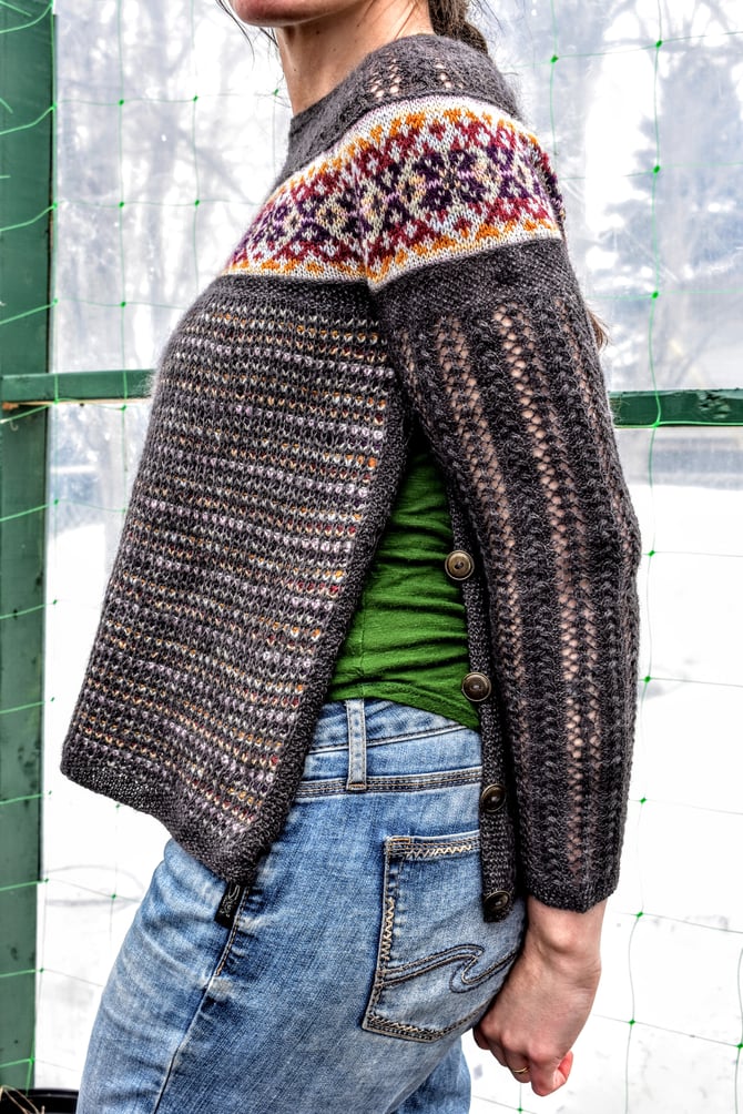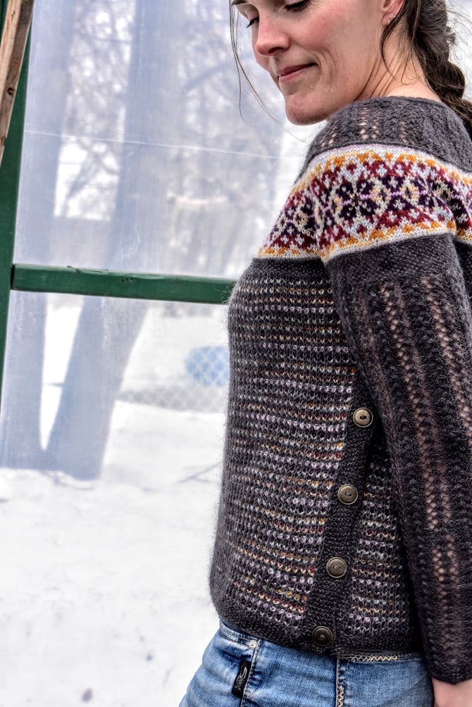 The pebbly aesthetic of Flatrock is a symphony of stitches. The front and back body flaps are rows and rows of fun tuck stitch knitting, and can be worn buttoned-up or open at the sides. Sleeves are knit bottom up in a 13-st x 4-row cable lace repeat. The body flaps and sleeves are join at the start of the yoke. The yoke is in the round starting with seed stitch and short rows across the back, transitioning to the colourwork band, then raglan shaping in the cable lace stitch. A cable plait finishes the neckline.