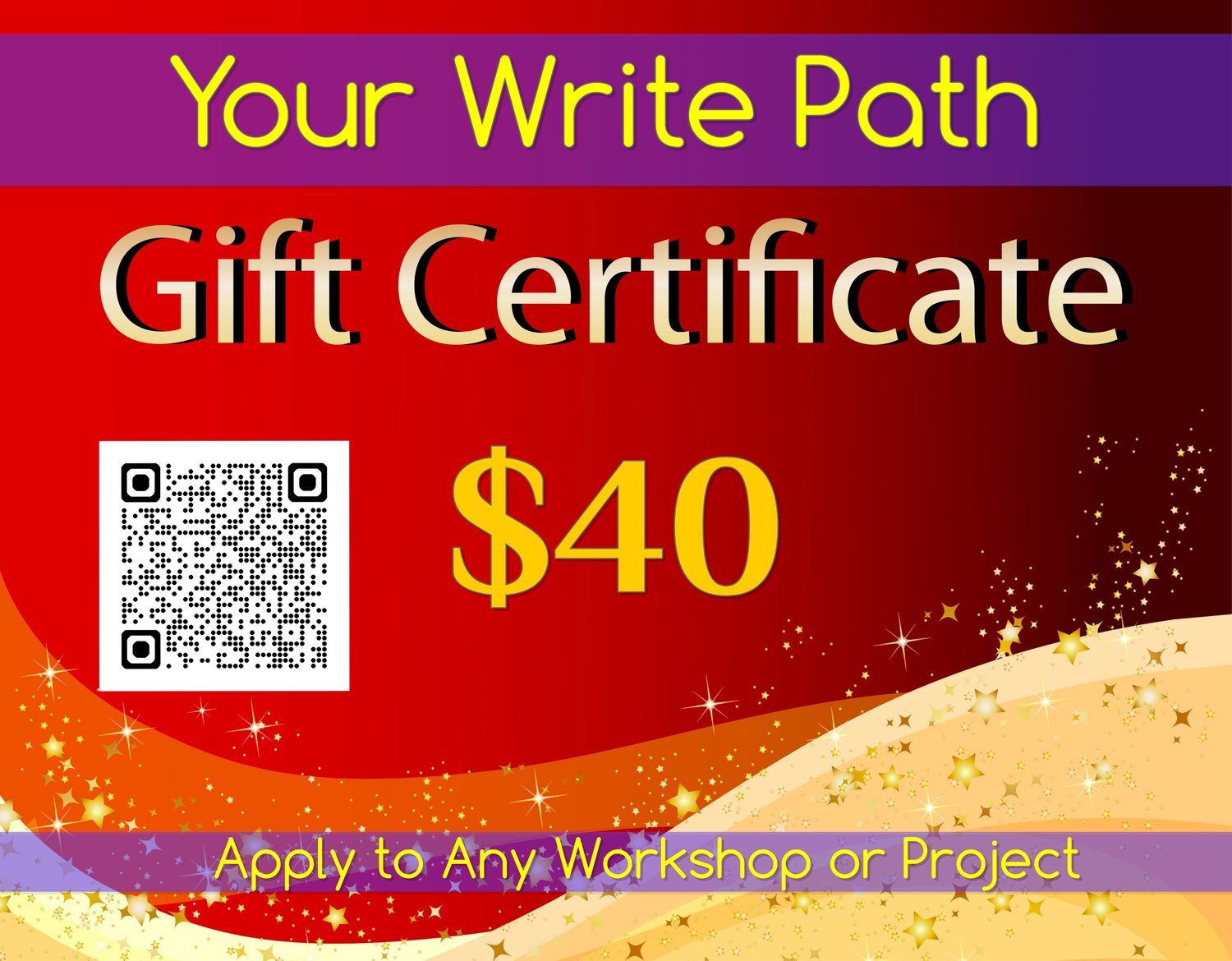 $40 total (includes required tax - Your Write Path pays!) gift certificate for any workshops or projects.