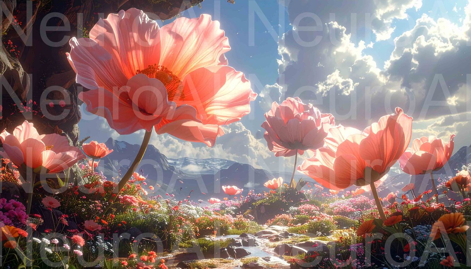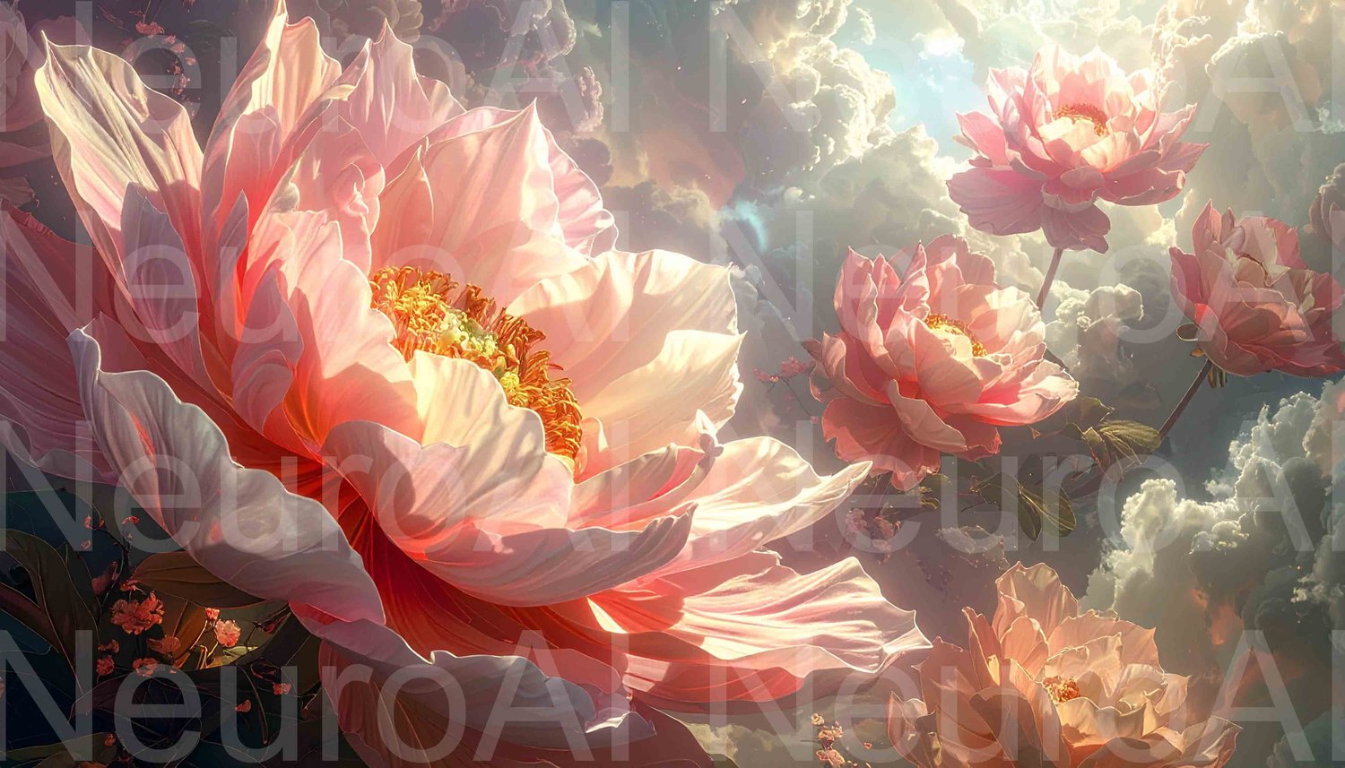 Dreamy pink flowers floating in ethereal sky