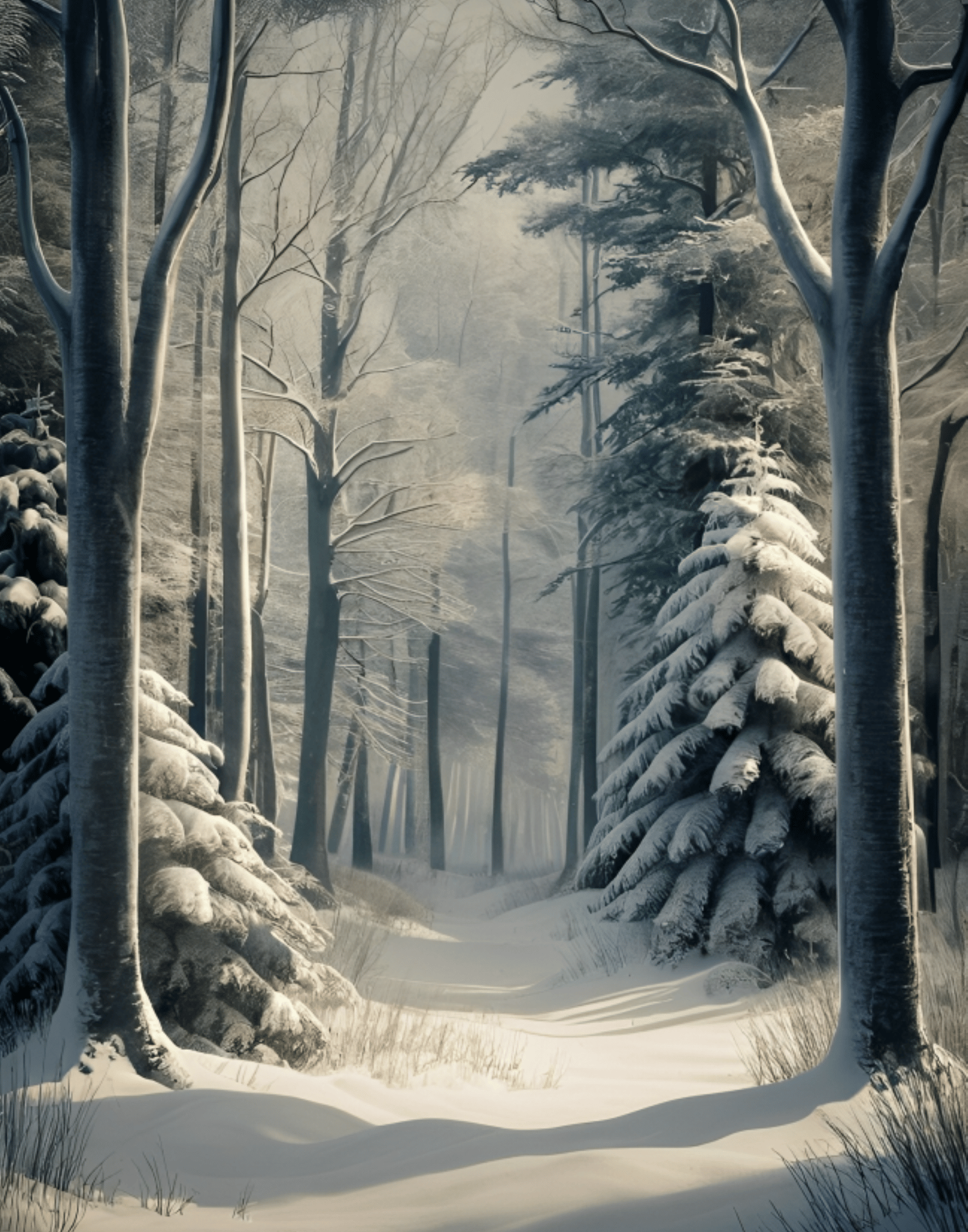Snowy Forest Landscape, Winter Forest, Nostalgic Nature, Cool Nature, Rustic natural Landscape, Painting.