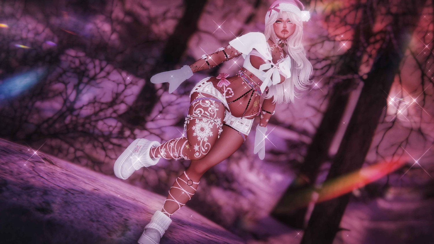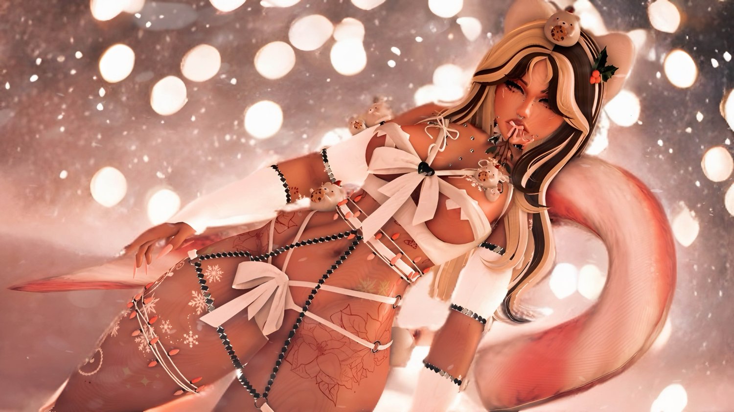 Acc: garter, leg lights, leg ribbons, choker, blindfold, earmuffs, fuzz tree, mouth bow, santa hat, fuzzy headscarf, armbows, bears , bowchoker, chest bows, back candycane, mittens, shawl, sleeves, waist lights bellchoker? fig? mistletoe? face candycane?