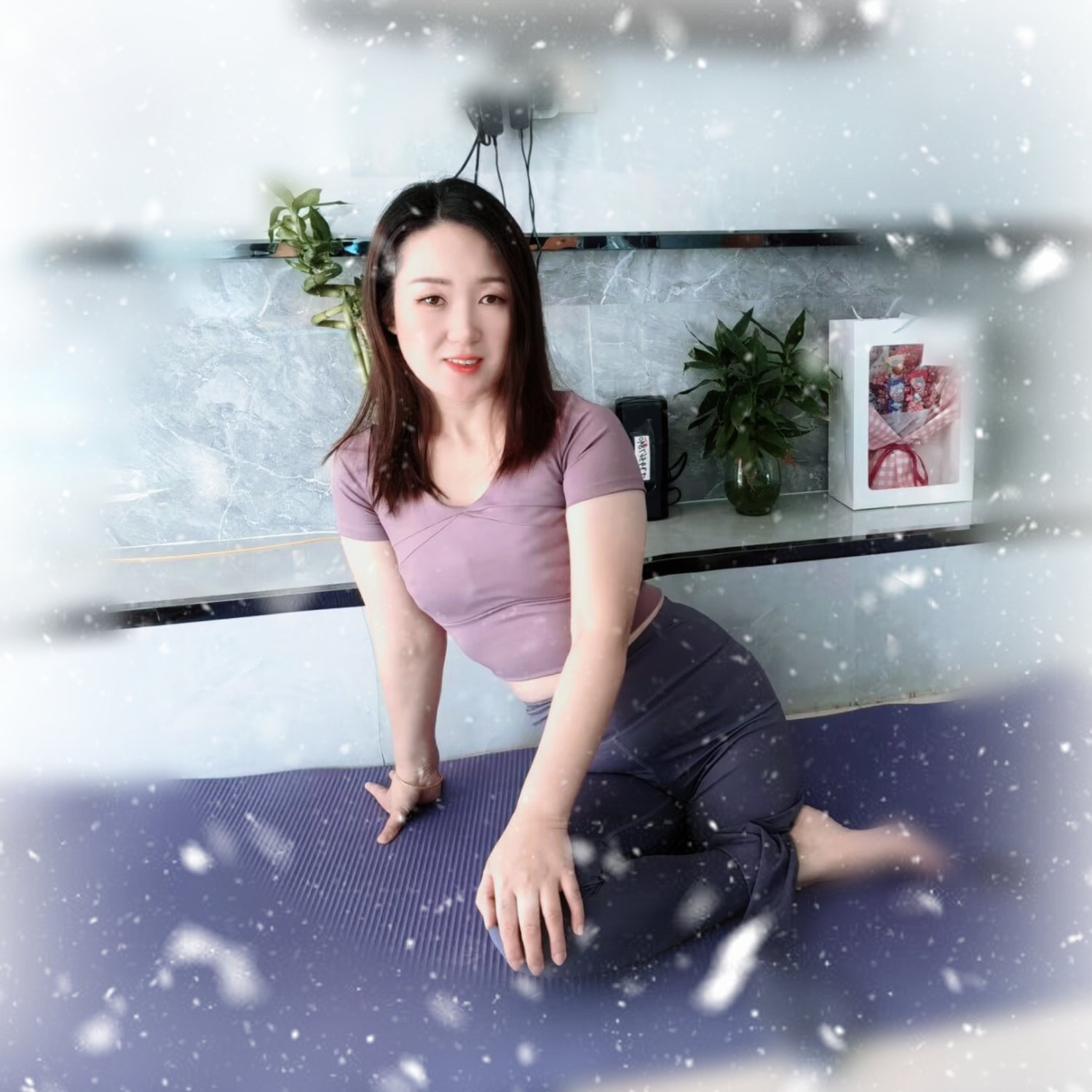 Iris sent a sweet greeting and started practicing yoga on the mat.