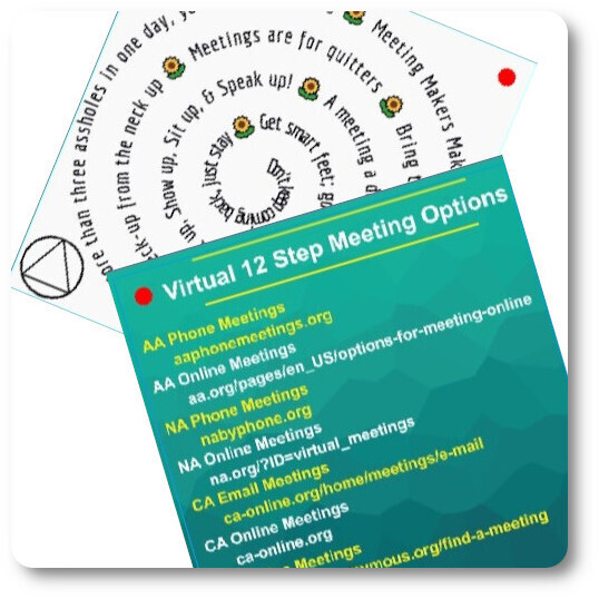 - BONUS: 10 Virtual Meeting Finder Cards (on metallic cord, tree-hangable) – connects to AA/NA support.