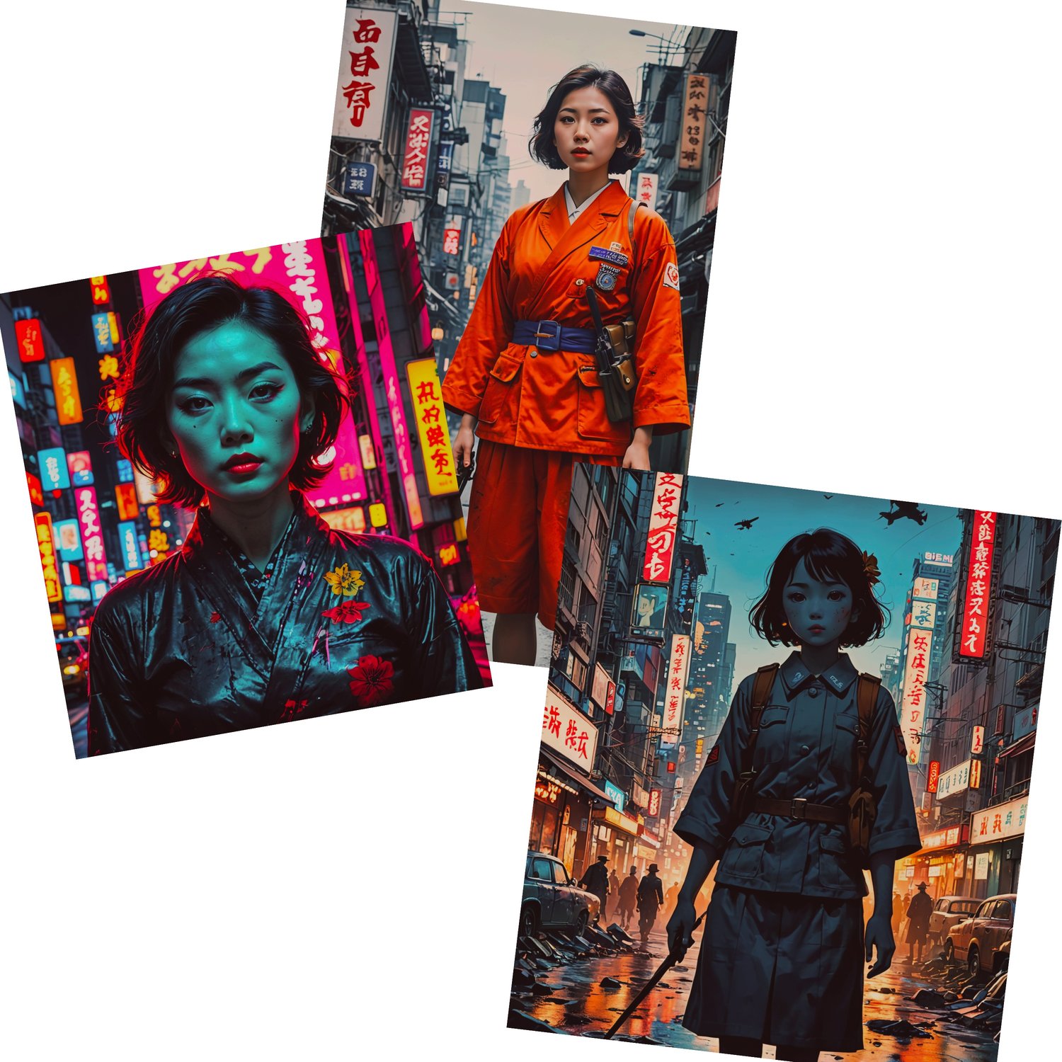 The second photo captures a woman in a dark kimono, her face illuminated by the glow of neon signs. The contrast between her traditional attire and the hyper-modern backdrop creates a striking visual metaphor for the blending of old and new in Asian metropolises.