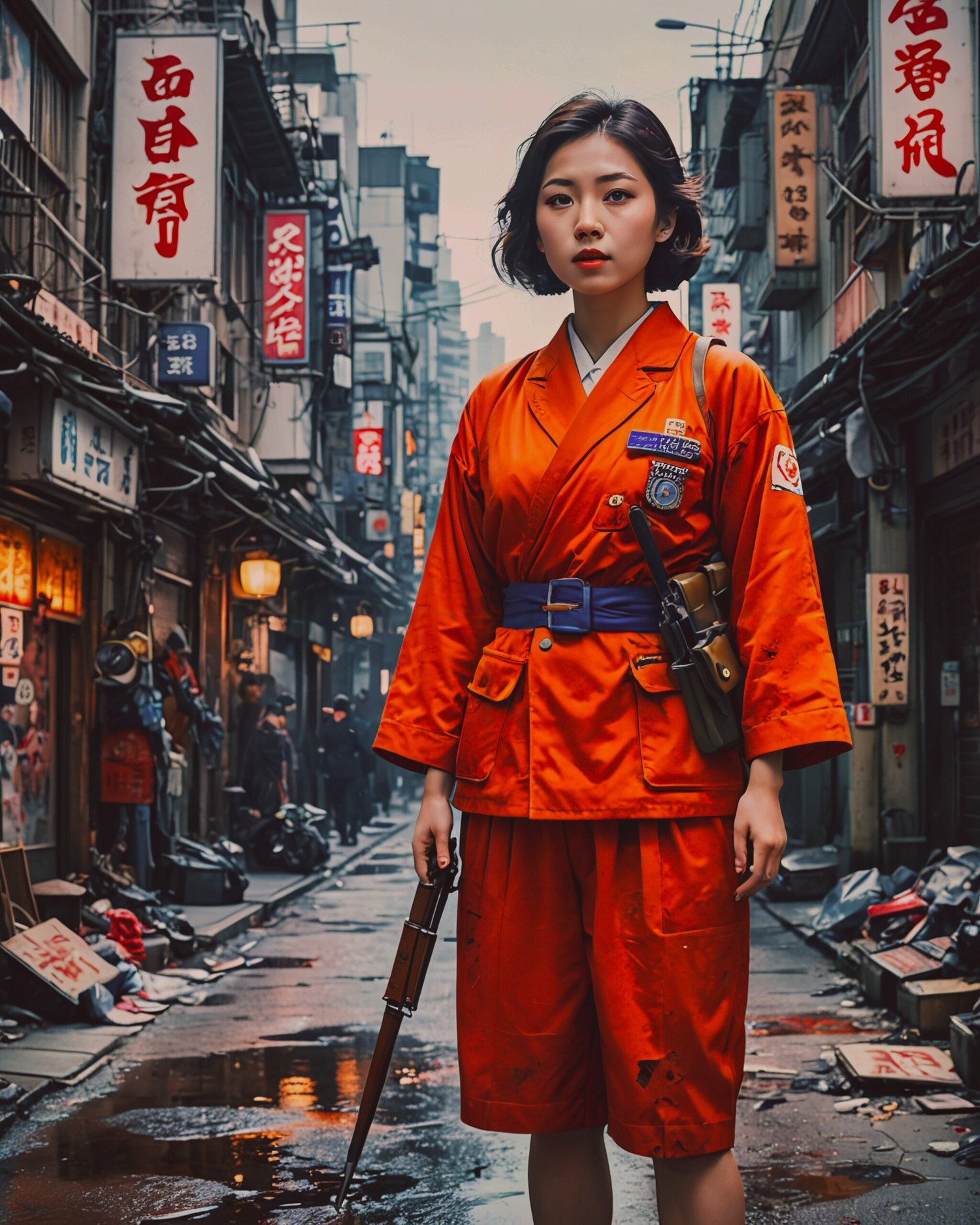 The first image shows a woman in a bright orange emergency services uniform standing in a narrow alley lined with signs and lanterns. She appears resolute, ready to face whatever challenges lie ahead in the chaotic urban environment.