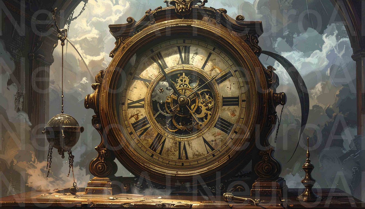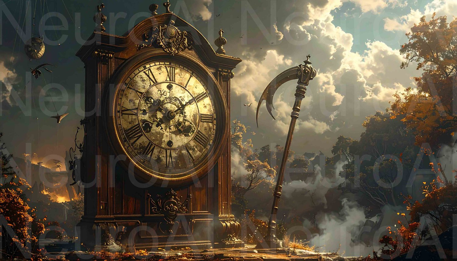 Antique clock with scythe on a fantasy landscape