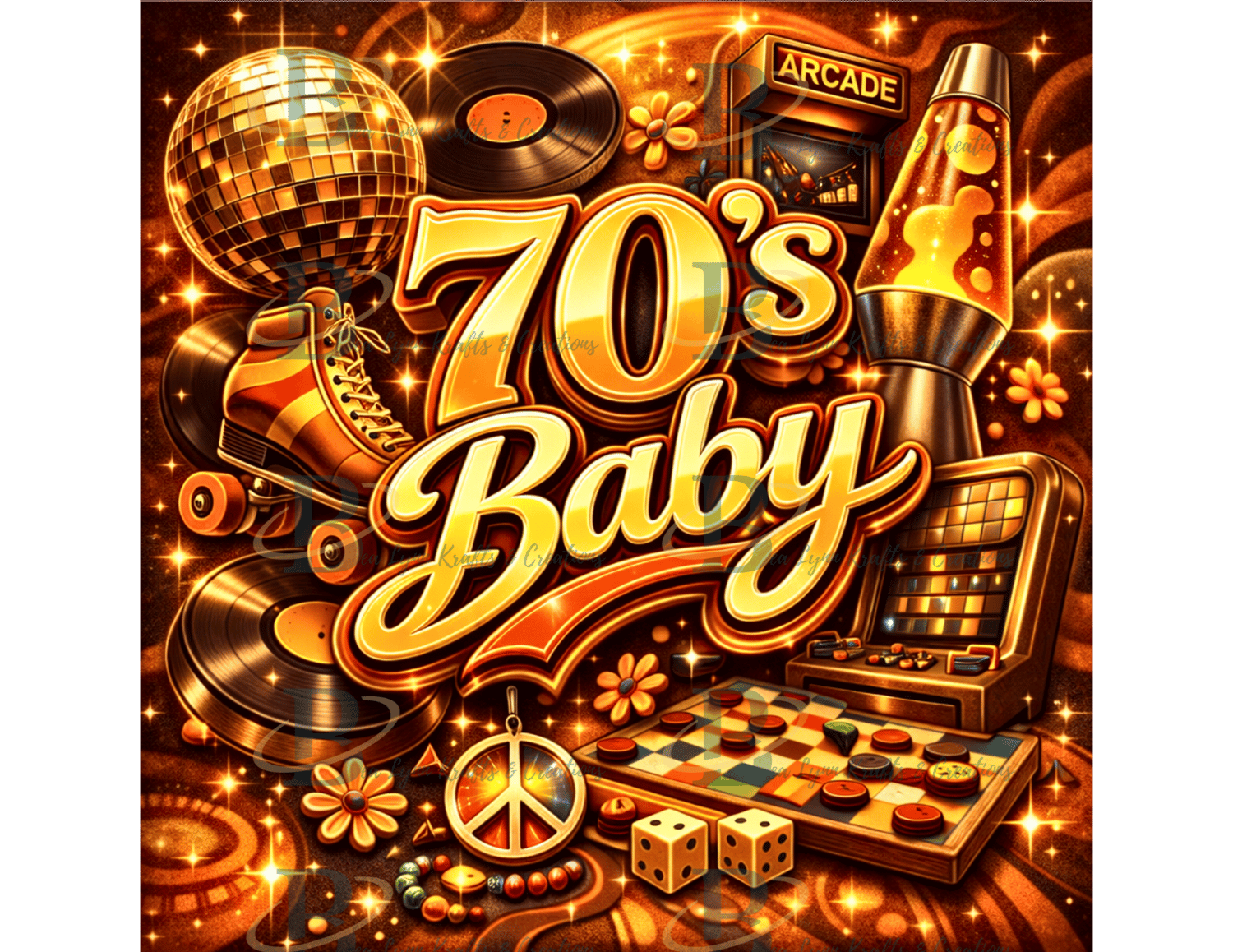 Celebrate the groovy vibes of the 1970s with this bold “70’s Baby” retro design! Inspired by the disco era, this artwork features vibrant vintage lettering surrounded by classic 70s nostalgia like vinyl records, roller skates, disco lights, arcade games, and retro board games. The warm tones of orange, gold, mustard yellow, and brown capture the unforgettable energy of 1970s disco and pop culture.