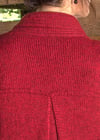 This cardigan is worked from the top down, beginning at the back shoulders. The back is worked to the armholes, including the beginning of a back gusset, then placed on hold while the fronts are picked up from the back shoulders and worked to the armholes. Then the back and fronts are joined and the body is worked to the bottom edge. The back gusset that was begun before fronts and back were joined is continued to the bottom edge, giving the cardigan its swing shape. The sleeves are picked up from the armholes and worked to the cuffs, with short-row shaping to shape the sleeve caps.