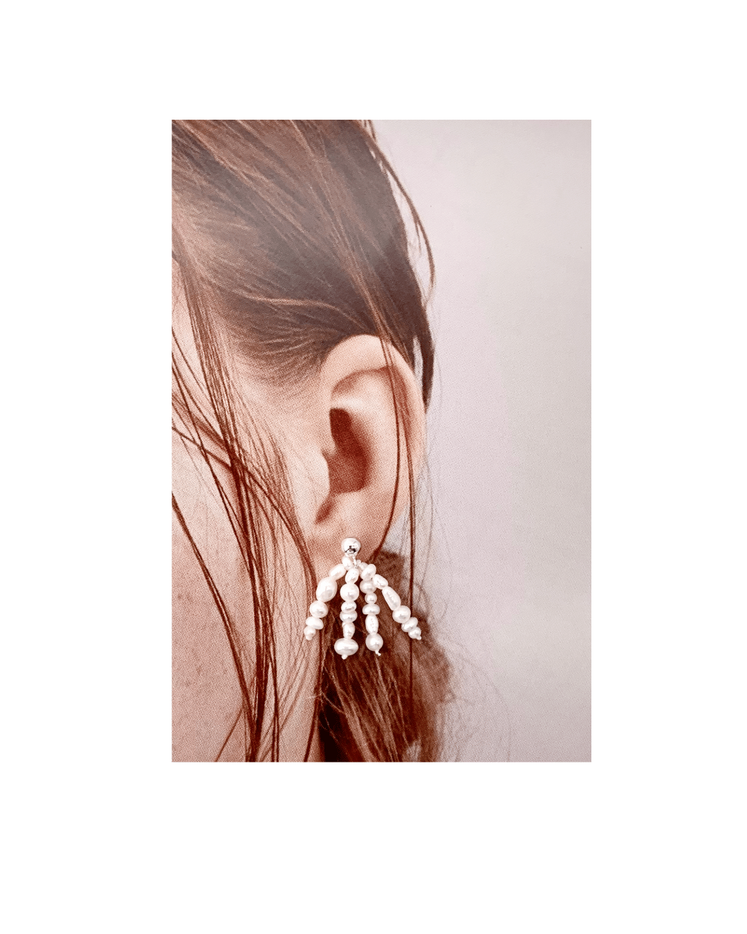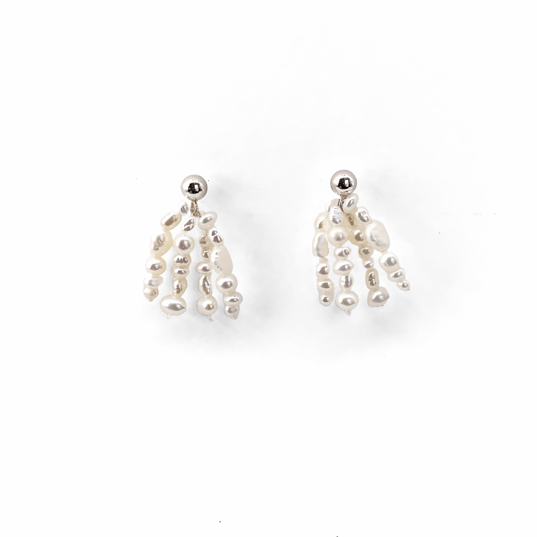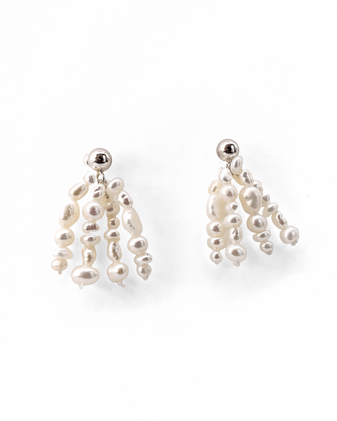 These earrings are crafted from six types of natural pearls in various shapes and sizes, creating a layered silhouette with an organic, flowing feel. Set on 925 sterling silver studs for comfortable, hypoallergenic wear. Each pearl is unique, offering a naturally asymmetrical elegance with a relaxed touch.