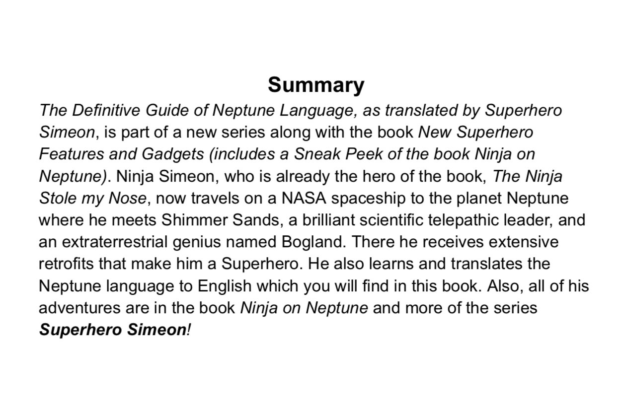 The Definitive Guide of Neptune Language, as translated by Superhero Simeon, is part of a new series along with the book New Superhero Features and Gadgets (includes a Sneak Peek of the book Ninja on Neptune). Ninja Simeon, who is already the hero of the book, The Ninja Stole my Nose, now travels on a NASA spaceship to the planet Neptune where he meets Shimmer Sands, a brilliant scientific telepathic leader, and an extraterrestrial genius named Bogland. There he receives extensive retrofits that make him a Superhero. He also learns and translates the Neptune language to English which you will find in this book. Also, all of his adventures are in the book Ninja on Neptune and more of the series Superhero Simeon!