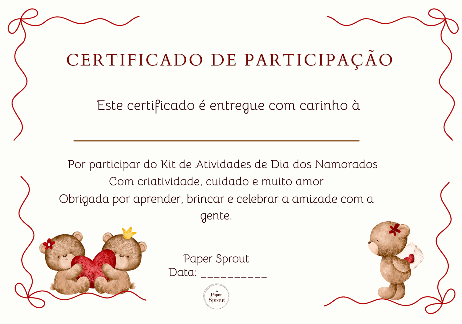 Este Certificado de Conclusão foi criado para celebrar o esforço, a participação e o aprendizado das crianças ao realizarem as Atividades de Matemática & Lógica – Dia dos Namorados ❤️