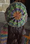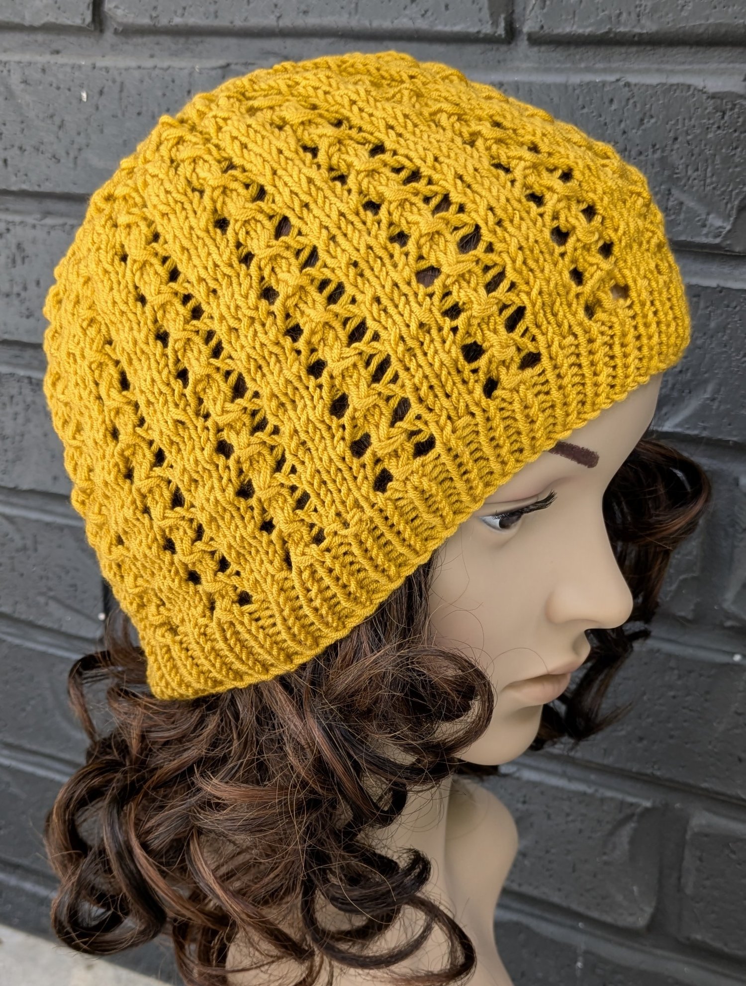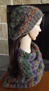 This slouchy Beanie and Scarf set are worked in a lovely lace stitch. The Beanie has a 2x2 rib brim.