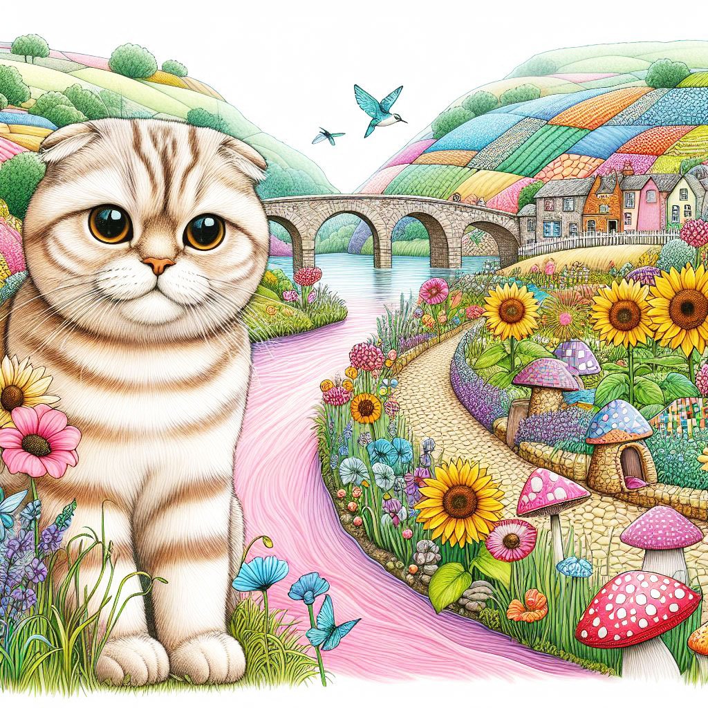 A SCottish Fold CAt is a popular breed of cat & this one looks at home beside a pink river. There are hills, birds, butterflies, flowers, houses, a little bridge & a windmill.