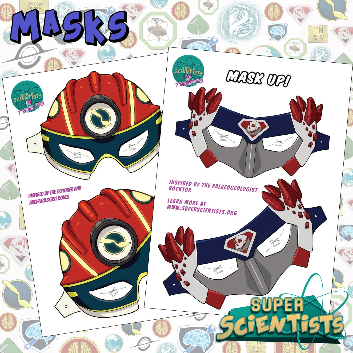 Download and colour print masks based on Bones and Rocktor (both in our comic and animation) and go exploring for fossils and adventure!
