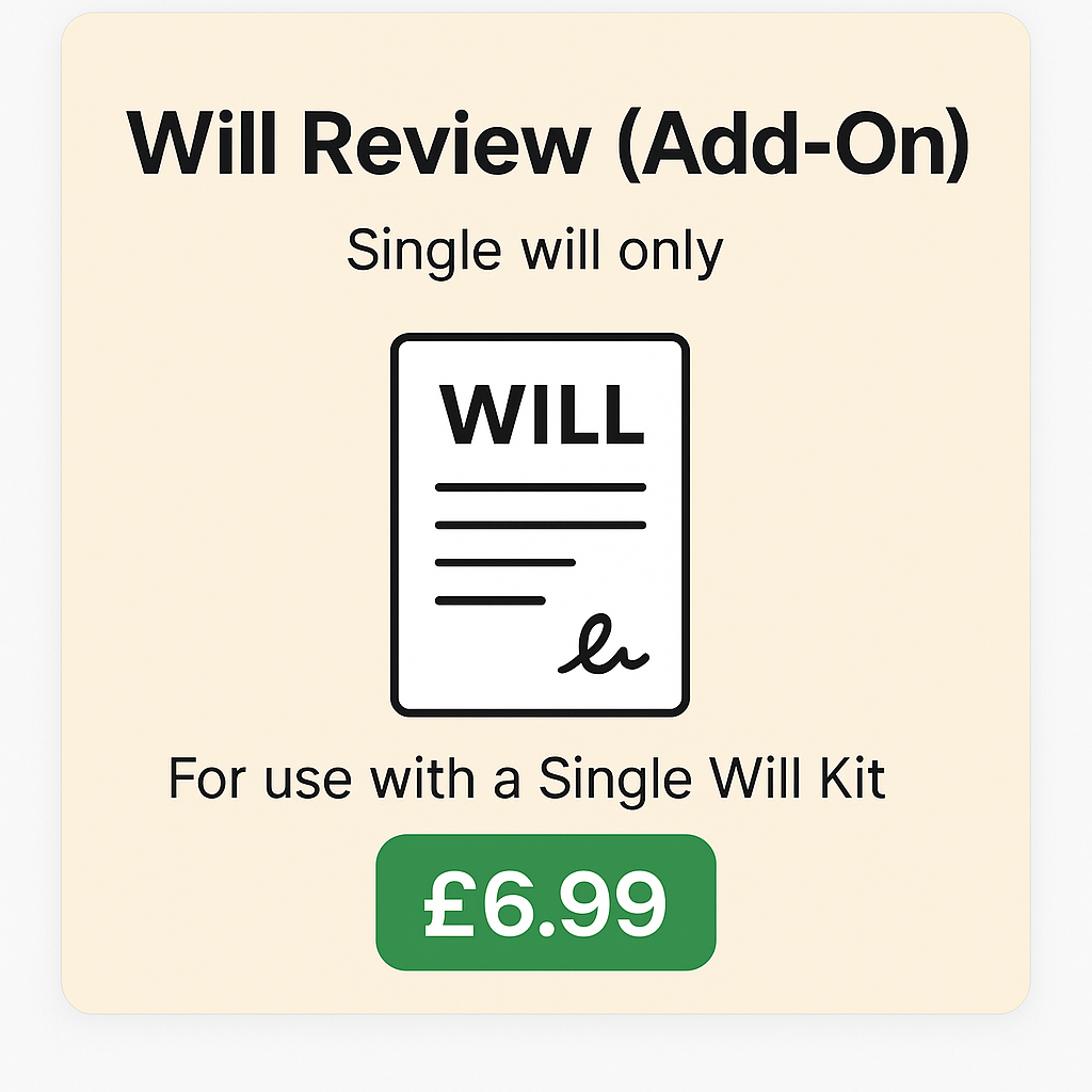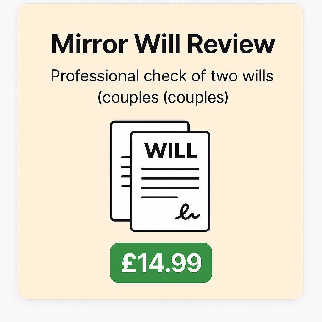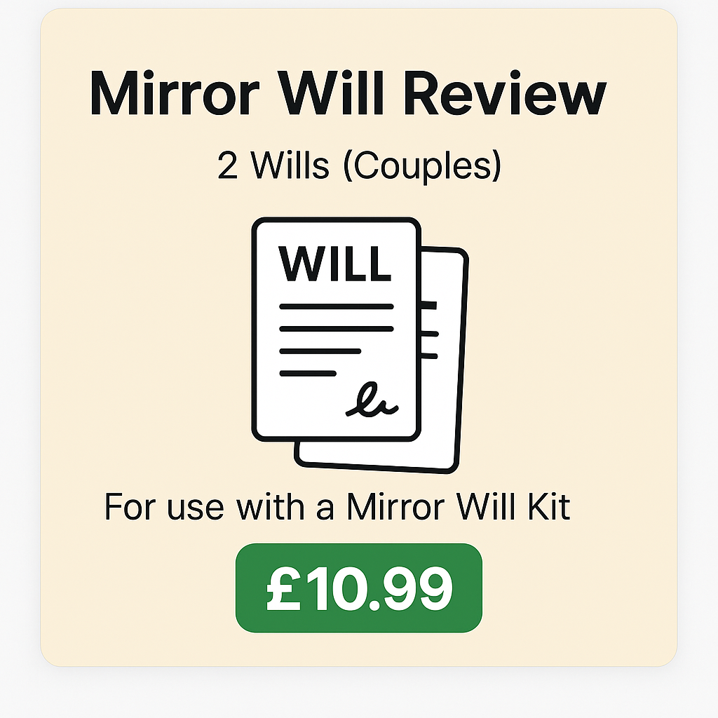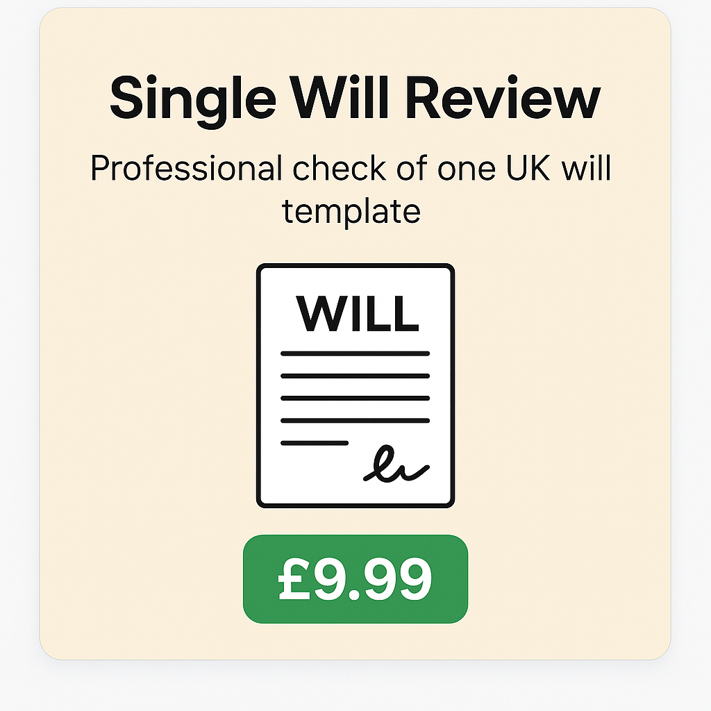 A full review of your filled UK will template (no edits or legal advice), with written feedback in 48h.