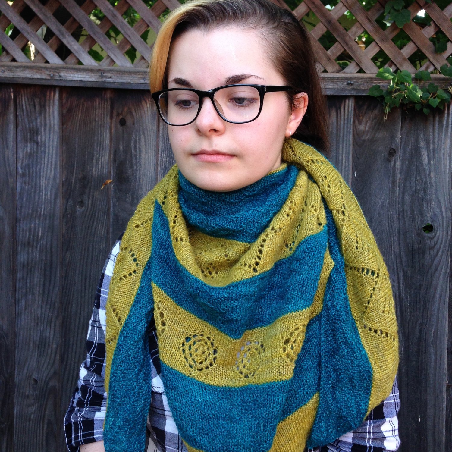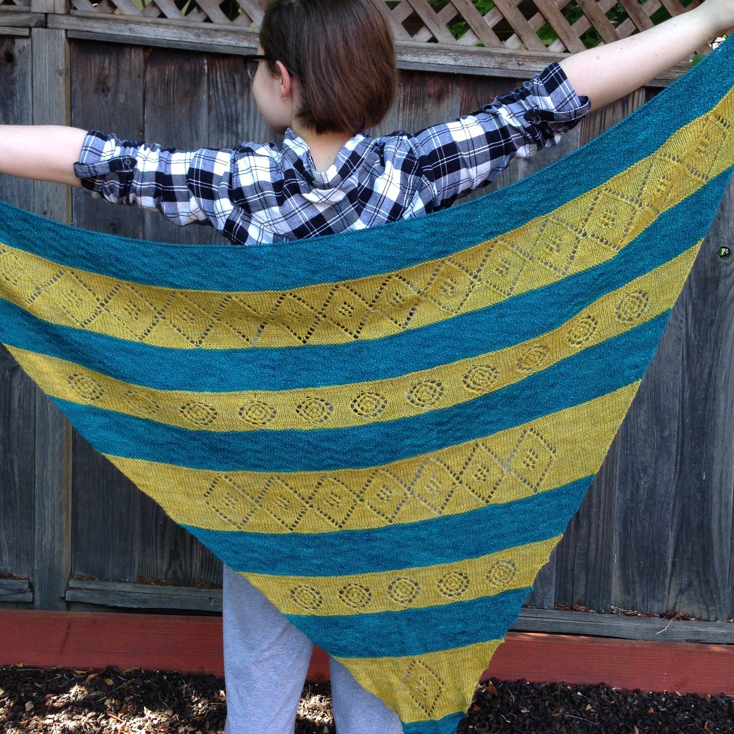 Sizes available: One size ~ Sample is 58” / 147cm wide X 40” / 102cm from top to the bottom tip after blocking